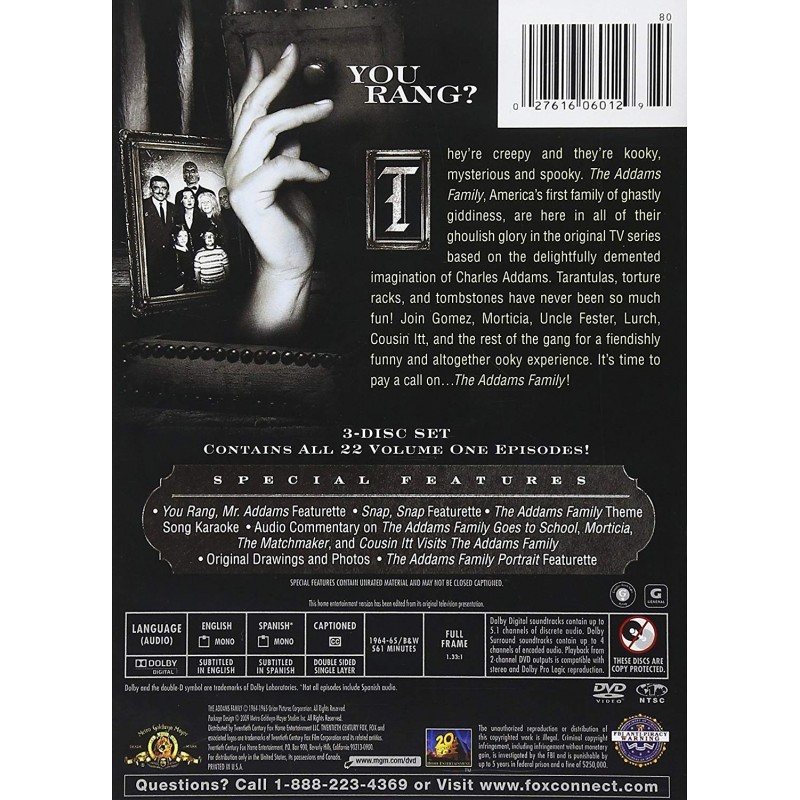 Cantidad de Discos: 3 | Lanzamiento: 2010 | Género(s): Serie de TV, Comedia, Fantástico | Audio: Español, Inglés | SubtÃtulos: Español, Inglés | TÃtulo: The Addams Family – First Volume 1964 | Director(es): Sidney Lanfield, Sidney Salkow, Jerry Hopper, Jean Yarbrough, Arthur Hiller, Arthur Lubin, Sidney Miller, Nat Perrin, Stanley Z. Cherry | Reparto: Sidney Lanfield, Sidney Salkow, Jerry Hopper, Jean Yarbrough, Arthur Hiller, Arthur Lubin, Sidney Miller, Nat Perrin, Stanley Z. Cherry | Norma / Región: NTSC 1 | Cantidad de Discos: 3 | Lanzamiento: 2010 | Género(s): Serie de TV, Comedia, Fantástico | Audio: Español, Inglés | SubtÃtulos: Español, Inglés | TÃtulo: The Addams Family – First Volume 1964 | Director(es): Sidney Lanfield, Sidney Salkow, Jerry Hopper, Jean Yarbrough, Arthur Hiller, Arthur Lubin, Sidney Miller, Nat Perrin, Stanley Z. Cherry | Reparto: Sidney Lanfield, Sidney Salkow, Jerry Hopper, Jean Yarbrough, Arthur Hiller, Arthur Lubin, Sidney Miller, Nat Perrin, Stan