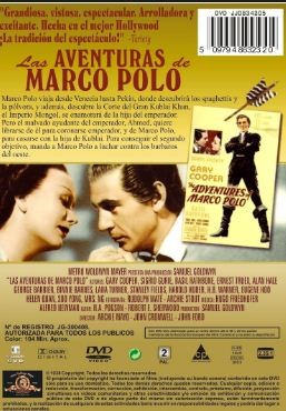 Cantidad de Discos: 1 | Lanzamiento: 2007 | Género(s): Drama, Romance | Audio: Inglés, Español, Francés | Subtítulos: Español, Inglés | Título: Las Aventuras de Marco Polo | Director(es): Archie Mayo, John Cromwell | Reparto: Gary Cooper, Sigrid Gurie, Basil Rathbone, George Barbier, Binnie Barnes | Norma / Región: NTSC 1 | Cantidad de Discos: 1 | Lanzamiento: 2007 | Género(s): Drama, Romance | Audio: Inglés, Español, Francés | Subtítulos: Español, Inglés | Título: Las Aventuras de Marco Polo | Director(es): Archie Mayo, John Cromwell | Reparto: Gary Cooper, Sigrid Gurie, Basil Rathbone, George Barbier, Binnie Barnes | Norma / Región: NTSC 1