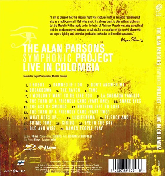 Artista(s) / Grupo: The Alan Parsons Symphonic Project | Cantidad de Discos: 1 | Lanzamiento: 2016 | Género(s): Electronic, Rock, Pop | Estilo(s): Pop Rock, Prog Rock, Symphonic Rock | TÃtulo: Live In Colombia | Norma / Región: Multizona | Artista(s) / Grupo: The Alan Parsons Symphonic Project | Cantidad de Discos: 1 | Lanzamiento: 2016 | Género(s): Electronic, Rock, Pop | Estilo(s): Pop Rock, Prog Rock, Symphonic Rock | TÃtulo: Live In Colombia | Norma / Región: Multizona | Artista(s) / Grupo: The Alan Parsons Symphonic Project | Cantidad de Discos: 1 | Lanzamiento: 2016 | Género(s): Electronic, Rock, Pop | Estilo(s): Pop Rock, Prog Rock, Symphonic Rock | TÃtulo: Live In Colombia | Norma / Región: Multizona