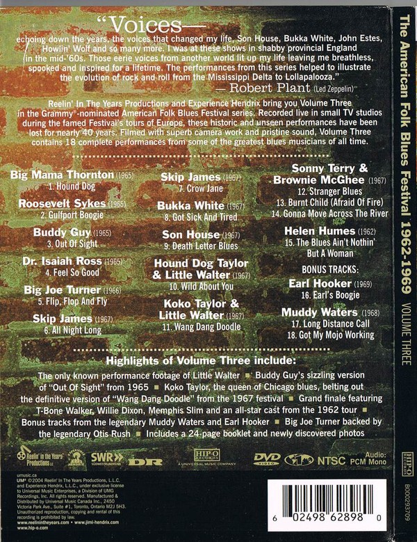 Artista(s) / Grupo: Varios | Cantidad de Discos: 1 | Lanzamiento: 2004 | Género(s): Blues | Estilo(s): Country Blues, Texas Blues, Electric Blues | TÃtulo: The American Folk Blues Festival 1962-1969 Volume Three | Norma / Región: NTSC (Región 1, 4) | Artista(s) / Grupo: Varios | Cantidad de Discos: 1 | Lanzamiento: 2004 | Género(s): Blues | Estilo(s): Country Blues, Texas Blues, Electric Blues | TÃtulo: The American Folk Blues Festival 1962-1969 Volume Three | Norma / Región: NTSC (Región 1, 4)