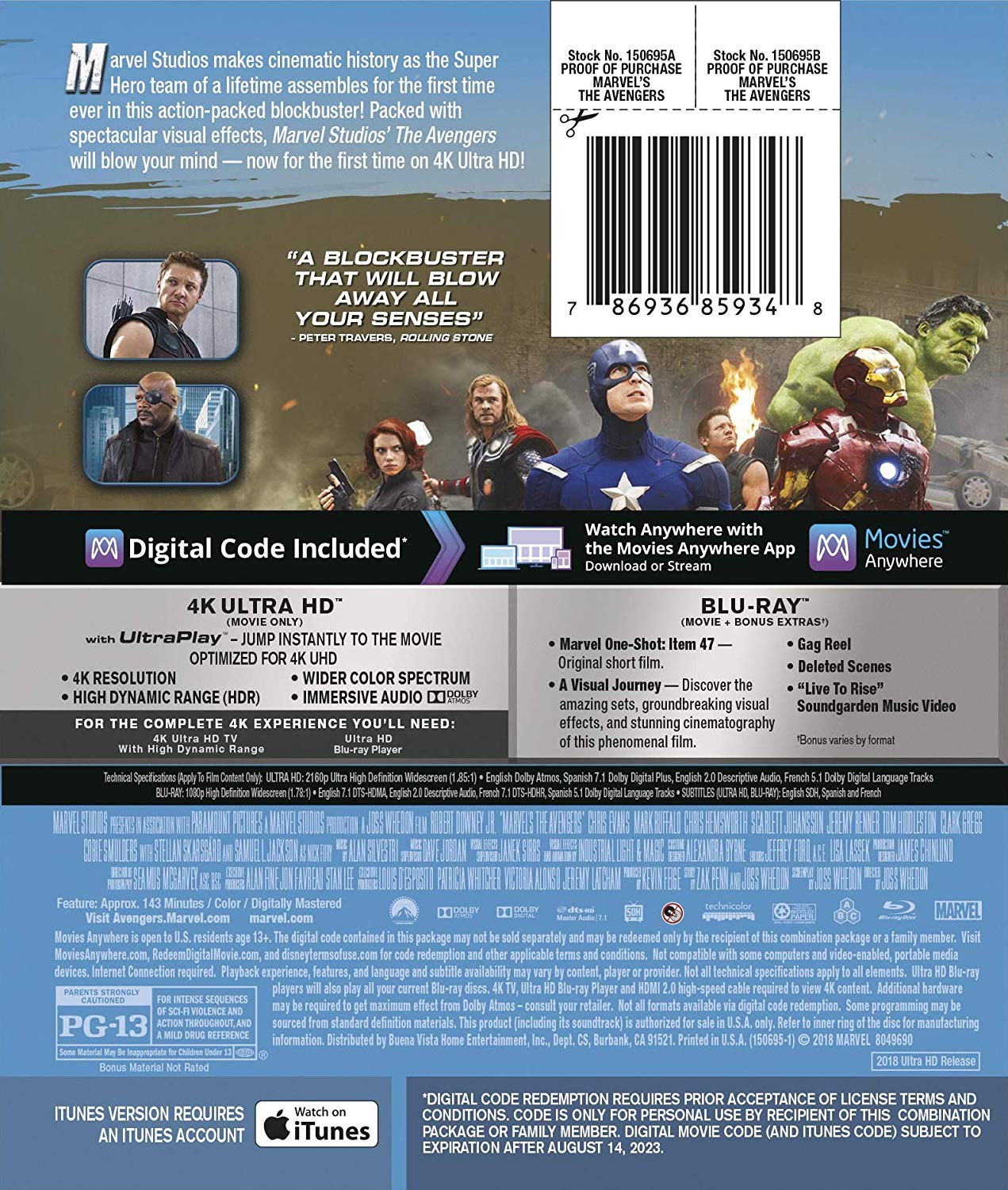 Cantidad de Discos: 1 4K + 1 BluRay | Lanzamiento: 2018 | Género(s): Acción, Ciencia Ficción | Audio: Inglés (Dolby Digital 5,1), Español (Dolby Digital Stereo, Dolby Digital 5,1), Francés (Dolby Digital Stereo, Dolby Digital 5,1) | SubtÃtulos: Español, Inglés | TÃtulo: Los Vengadores | Reparto: Robert Downey Jr., Chris Evans, Mark Ruffalo, Chris Hemsworth, Jeremy Renner, Scarlett Johansson, Tom Hiddleston, Samuel L. Jackson, Cobie Smulders, Clark Gregg, Gwyneth Paltrow, Stellan Skarsgard, Paul Bettany, Maximiliano Hernández, Alexis Denisof, Jerzy Skolimowski, Tina Benko, Powers Boothe, Harry Dean Stanton, Stan Lee, Jeff Wolfe, Jenny Agutter, Arthur Darbinyan, Donald Li, Warren Kole, Alicia Sixtos, Jesse Garcia, Dieter Riesle, Kenneth Tigar, Walter Perez, Josh Cowdery, Ashley Johnson, Robert Clohessy, Enver Gjokaj, Robin Swoboda, Jamie McShane, Michael Zhang, Romy Rosemont, James Eckhouse, Pat Kiernan, Thomas Roberts, Damion Poitier | Norma / Región: NTSC 1 | Cantidad de Discos: 1 4K + 1 BluRay |