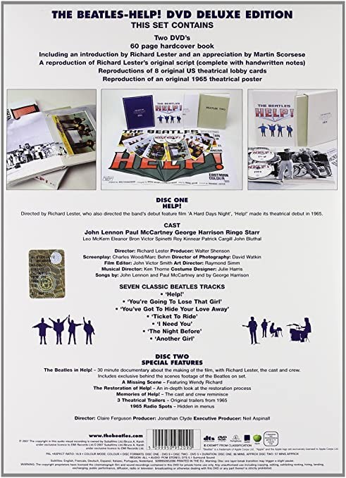 Artista(s) / Grupo: The Beatles | Cantidad de Discos: 2 DVD + 1 Libro + FotografÃas + 1 Poster | Lanzamiento: 2017 | Género(s): Rock & Roll | Estilo(s): Beat, Soundtrack, Pop Rock | Audio: Inglés | TÃtulo: Help! – The Beatles | Norma / Región: NTSC 1 | Artista(s) / Grupo: The Beatles | Cantidad de Discos: 2 DVD + 1 Libro + FotografÃas + 1 Poster | Lanzamiento: 2017 | Género(s): Rock & Roll | Estilo(s): Beat, Soundtrack, Pop Rock | Audio: Inglés | TÃtulo: Help! – The Beatles | Norma / Región: NTSC 1