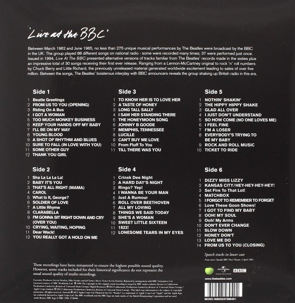 Artista(s) / Grupo: The Beatles | Cantidad de Discos: 3 LP | Estilo(s): Rock & Roll, Pop Rock | TÃtulo: Live in the BBC | Sub-CategorÃas: Rock | Artista(s) / Grupo: The Beatles | Cantidad de Discos: 3 LP | Estilo(s): Rock & Roll, Pop Rock | TÃtulo: Live in the BBC | Sub-CategorÃas: Rock