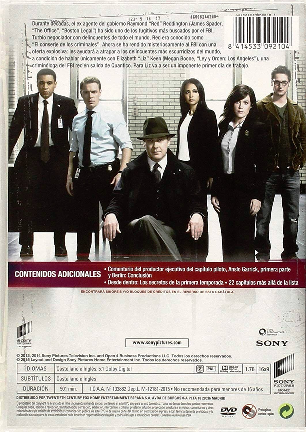 Cantidad de Discos: 6 | Lanzamiento: 2013 | Género(s): Serie de TV, Drama, Intriga | Audio: Español (Dolby Digital 5,1), Inglés (Dolby Digital 5,1) | SubtÃtulos: Español, Inglés | TÃtulo: The Blacklist – 1 Season | Director(es): Jon Bokenkamp (Creator), Michael W. Watkins, Andrew McCarthy, Steven A. Adelson, Karen Gaviola, Donald E. Thorin Jr., Bill Roe, Joe Carnahan, John Terlesky, Vincent Misiano, David Platt, Paul A. Edwards, Michael Zinberg, Terrence O’Hara, Alex Zakrzewski, Jace Alexander, Adam Arkin, Nick Gomez, Stephen Surjik, Dan Lerner, Peter Werner, Randy Zisk, Guy Ferland, Omar Madha, Ami Canaan Mann, Michael Waxman, Anton Cropper, Michael Zinberg, Eagle Egilsson, Tim Hunter, Kurt Kuenne, Mary Lambert, Michael Caracciolo, Jean de Segonzac, Christine Gee, Edward Ornelas | Reparto: James Spader, Megan Boone, Diego Klattenhoff, Harry Lennix, Hisham Tawfiq, Amir Arison, Ryan Eggold, Mozhan Marnò, Parminder Nagra, Susan Blommaert, Baz, Adriane Lenox, Edi Gathegi, David Strathairn, Valarie Petti