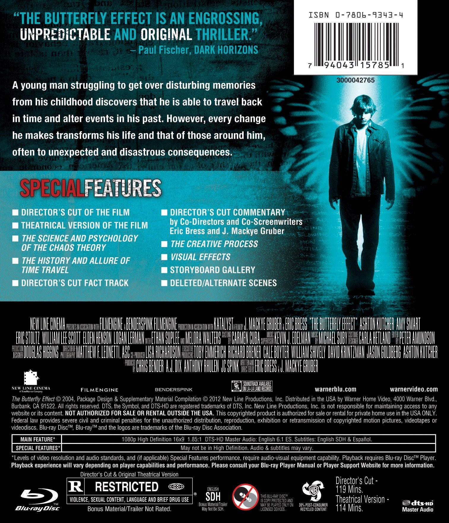 Cantidad de Discos: 1 | Lanzamiento: 2004 | Género(s): Fantástico. Thriller. Drama | Audio: Inglés (DTS-HD MA 5.1) | SubtÃtulos: Español, Inglés | TÃtulo: El efecto mariposa | Director(es): Eric Bress, J. Mackye Gruber | Reparto: Ashton Kutcher, Amy Smart, Kevin Schmidt, Melora Walters, Elden Henson, Eric Stoltz, John Patrick Amedori, Cameron Bright, William Lee Scott, Brandy Kopp, Ethan Suplee, Grant Thompson, Logan Lerman, Daniel Spink, Kendall Cross, Amy Esterle, Meilani Paul, Chapelle Jaffe | Norma / Región: NTSC (Región A) | Cantidad de Discos: 1 | Lanzamiento: 2004 | Género(s): Fantástico. Thriller. Drama | Audio: Inglés (DTS-HD MA 5.1) | SubtÃtulos: Español, Inglés | TÃtulo: El efecto mariposa | Director(es): Eric Bress, J. Mackye Gruber | Reparto: Ashton Kutcher, Amy Smart, Kevin Schmidt, Melora Walters, Elden Henson, Eric Stoltz, John Patrick Amedori, Cameron Bright, William Lee Scott, Brandy Kopp, Ethan Suplee, Grant Thompson, Logan Lerman, Daniel Spink, Kendall Cross, Amy Esterle,