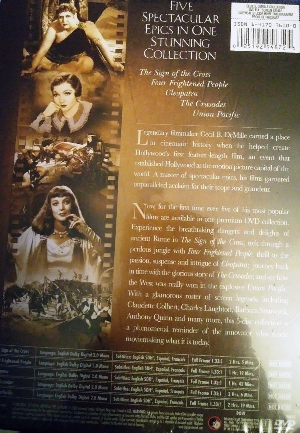 Cantidad de Discos: 5 | Lanzamiento: 2006 | Género(s): Aventuras. Drama. Épico. Religión. Histórico. | Audio: Inglés | SubtÃtulos: Español, Francés | TÃtulo: El signo de la cruz (1932) / Náufragos en la jungla (1934) / Cleopatra (1934) / Las Cruzadas (1935) / Unión Pacifico (1939) | Director(es): Cecil Blount Demille | Reparto: Fredric March, Charles Laughton, Claudette Colbert, Elissa Landi, Ian Keith, Vivian Tobin, Nat Pendleton /