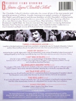Cantidad de Discos: 3 | Lanzamiento: 2009 | Género(s): Comedia, Suspenso, Drama | Audio: Inglés (Dolby Digital 2,0 Stereo) | SubtÃtulos: Español, Inglés, Francés | TÃtulo: The Claudette Colbert Collection: Three-Cornered Moon (1933) / Maid of Salem (1937) / I Met Him in Paris (1937) / Bluebeard’s Eighth Wife (1938) / No Time for Love (1943) / The Egg and I (1947) | Director(es): Elliott Nugent / Frank Lloyd / Wesley Ruggles / Ernst Lubitsch / Mitchell Leisen / Chester Erskine | Reparto: Claudette Colbert, Richard Arlen, Mary Boland, Wallace Ford, Lyda Roberti, Tom Brown, Joan Marsh/