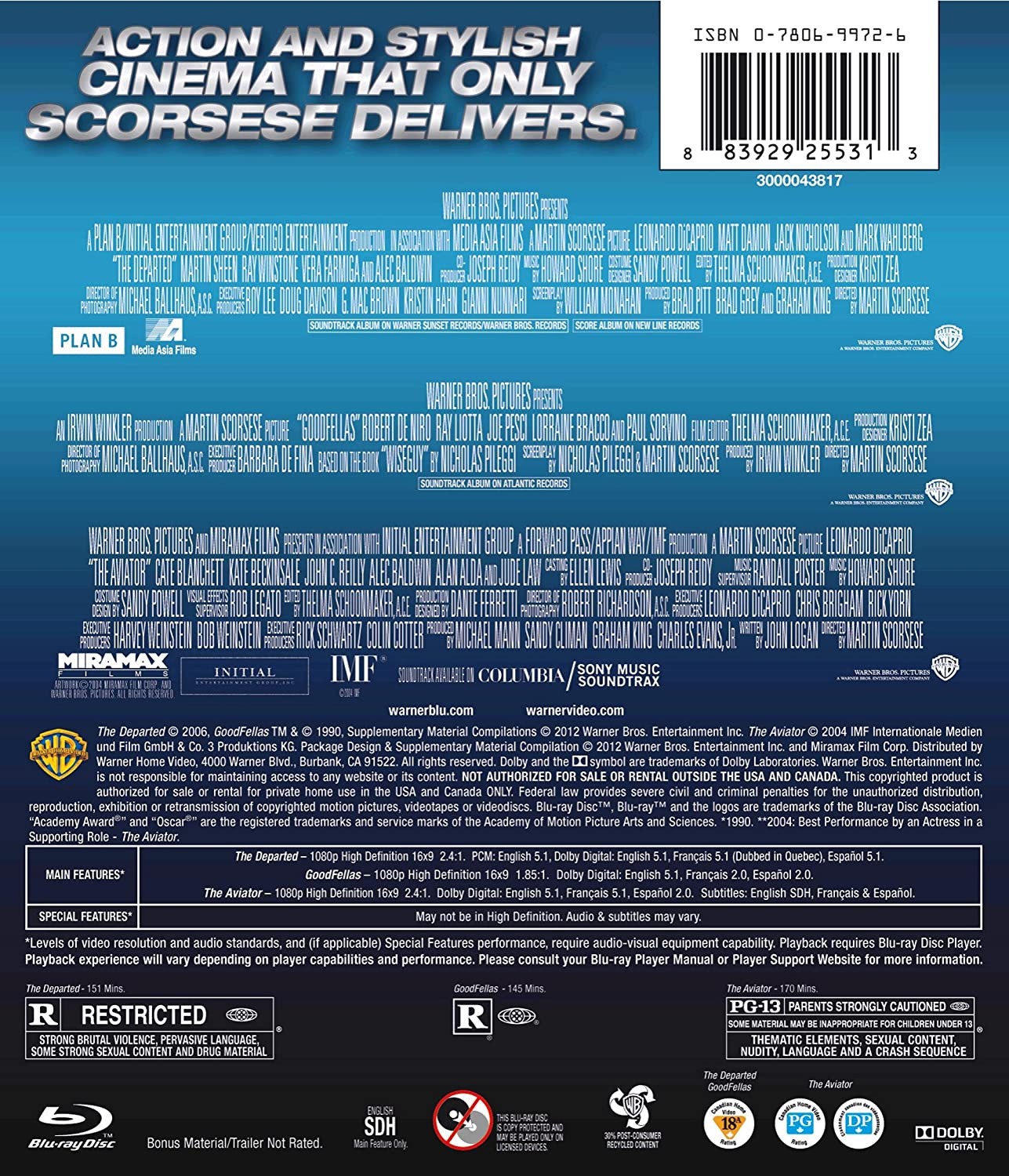 Cantidad de Discos: 3 | Lanzamiento: 2012 | Género(s): Drama | Audio: Inglés, Francés, Español | SubtÃtulos: Inglés, Francés, Español | TÃtulo: Goodfellas / The Aviator / The Departed | Director(es): Martin Scorsese | Reparto: Ray Liotta, Robert De Niro, Joe Pesci, Lorraine Bracco, Paul Sorvino, Chuck Low, Christopher Serrone, Debi Mazar, Gina Mastrogiacomo, Frank Sivero, / Leonardo DiCaprio, Cate Blanchett, Kate Beckinsale, Alec Baldwin, Willem Dafoe, Jude Law, Alan Alda, John C. Reilly, Gwen Stefani, Ian Holm, Brent Spiner, / Leonardo DiCaprio, Matt Damon, Jack Nicholson, Mark Wahlberg, Vera Farmiga, Alec Baldwin, Martin Sheen, Ray Winstone, Kevin Corrigan, James Badge Dale, | Norma / Región: NTSC (Región A) | Cantidad de Discos: 3 | Lanzamiento: 2012 | Género(s): Drama | Audio: Inglés, Francés, Español | SubtÃtulos: Inglés, Francés, Español | TÃtulo: Goodfellas / The Aviator / The Departed | Director(es): Martin Scorsese | Reparto: Ray Liotta, Robert De Niro, Joe Pesci, Lorraine Bracco,