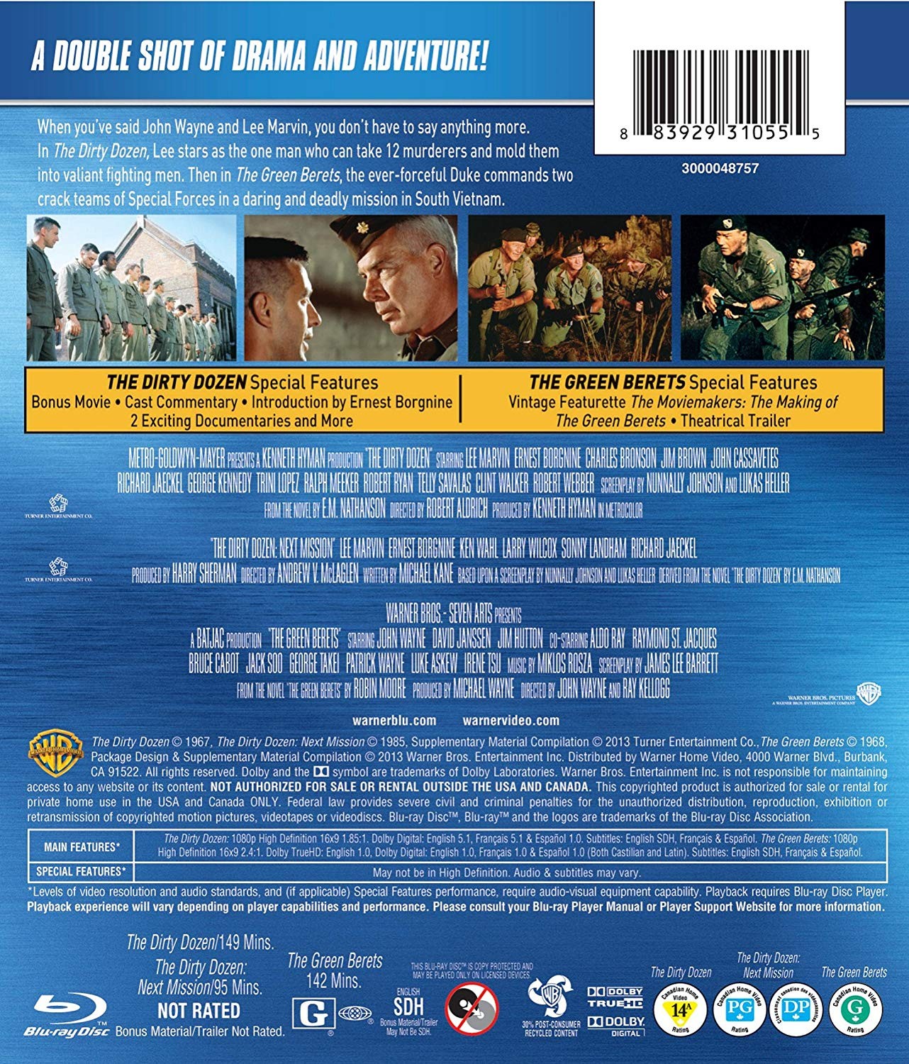 Cantidad de Discos: 2 | Lanzamiento: 2013 | Género(s): Drama, Bélico, Acción | Audio: Inglés (Dolby Digital 5,1), Español (Dolby Digital Stereo, Dolby Digital 5,1), Francés (Dolby Digital Stereo, Dolby Digital 5,1) | SubtÃtulos: Español, Inglés, Francés | TÃtulo: Doce del patÃbulo (1967) / Los boinas verdes (1968) | Director(es): Robert Aldrich / John Wayne, Ray Kellogg | Reparto: Lee Marvin, Charles Bronson, John Cassavetes, Ernest Borgnine, George Kennedy, Ralph Meeker, Donald Sutherland, Telly Savalas, Jim Brown, Richard Jaeckel, Trini Lopez, Robert Ryan, Clint Walker, Robert Webber /