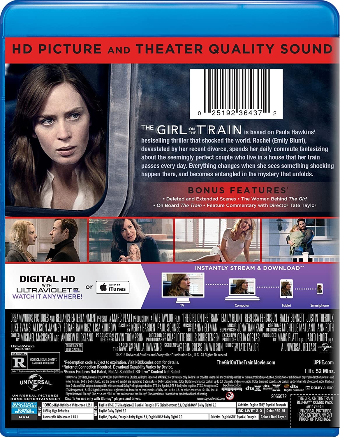 Cantidad de Discos: 1 Blu ray + 1 DVD | Lanzamiento: 2016 | Género(s): Thriller, Drama | Audio: Inglés, Español, Francés | Subtítulos: Español, Inglés, Francés | Título: The Girl on the Train | Director(es): Tate Taylor | Reparto: Emily Blunt, Rebecca Ferguson, Haley Bennett, Luke Evans, Edgar Ramirez, Justin Theroux, Allison Janney, Lisa Kudrow, Laura Prepon, Lana Young, Marko Caka, Danielle M. Williamson, Sidney Beitz, Darren Goldstein | Norma / Región: NTSC (Región A) | Cantidad de Discos: 1 Blu ray + 1 DVD | Lanzamiento: 2016 | Género(s): Thriller, Drama | Audio: Inglés, Español, Francés | Subtítulos: Español, Inglés, Francés | Título: The Girl on the Train | Director(es): Tate Taylor | Reparto: Emily Blunt, Rebecca Ferguson, Haley Bennett, Luke Evans, Edgar Ramirez, Justin Theroux, Allison Janney, Lisa Kudrow, Laura Prepon, Lana Young, Marko Caka, Danielle M. Williamson, Sidney Beitz, Darren Goldstein | Norma / Región: NTSC (Región A)