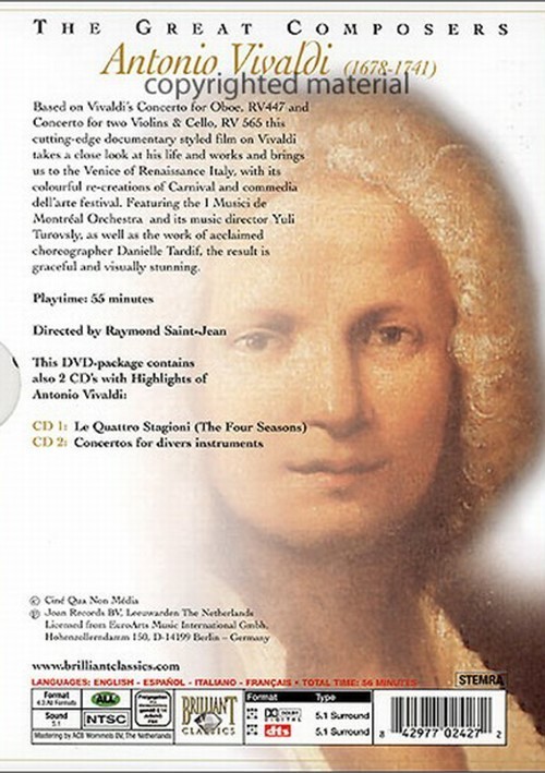 Basado en el Concierto para Oboe, RV447 y Concerto para dos violines y violonchelos, RV 565 de Vivaldi, este documental de vanguardia sobre Vivaldi analiza de cerca su vida y sus obras y nos lleva a la Venecia del Renacimiento en Italia, con su colorido re -Creaciones de carnaval y commedia dell’arte festival. Con la I Musici de Montréal Orchestra y su director musical Yuli Turovsly, así como el trabajo de la aclamada coreógrafa Danielle Tardif, el resultado es elegante y visualmente impresionante.
