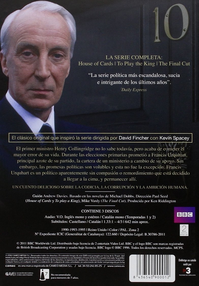 Cantidad de Discos: 3 | Lanzamiento: 2010 | Género(s): Miniserie de TV. Drama. PolÃtica | Audio: Inglés (Dolby Digital 2,0), Inglés (Dolby Digital Mono), Catalán | SubtÃtulos: Español, Catalán | TÃtulo: House of Cards (1990) | Director(es): Paul Seed | Reparto: Ian Richardson, Diane Fletcher, Susannah Harker, Miles Anderson, Alphonsia Emmanuel, Malcolm Tierney, Colin Jeavons, Damien Thomas, William Chubb, Kenneth Gilbert, Christopher Owen, David Lyon | Norma / Región: PAL (Región 2) | Cantidad de Discos: 3 | Lanzamiento: 2010 | Género(s): Miniserie de TV. Drama. PolÃtica | Audio: Inglés (Dolby Digital 2,0), Inglés (Dolby Digital Mono), Catalán | SubtÃtulos: Español, Catalán | TÃtulo: House of Cards (1990) | Director(es): Paul Seed | Reparto: Ian Richardson, Diane Fletcher, Susannah Harker, Miles Anderson, Alphonsia Emmanuel, Malcolm Tierney, Colin Jeavons, Damien Thomas, William Chubb, Kenneth Gilbert, Christopher Owen, David Lyon | Norma / Región: PAL (Región 2)