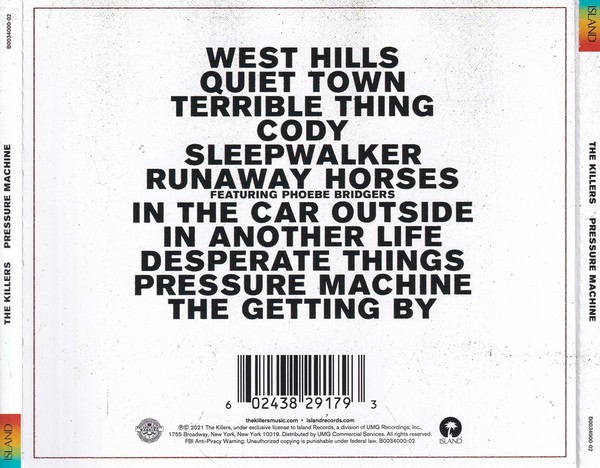 Artista(s) / Grupo: The Killers | Cantidad de Discos: 1 CD | Lanzamiento: 2021 | Género(s): Rock, Pop | Estilo(s): Alternative Rock | TÃtulo: Pressure Machine | Artista(s) / Grupo: The Killers | Cantidad de Discos: 1 CD | Lanzamiento: 2021 | Género(s): Rock, Pop | Estilo(s): Alternative Rock | TÃtulo: Pressure Machine