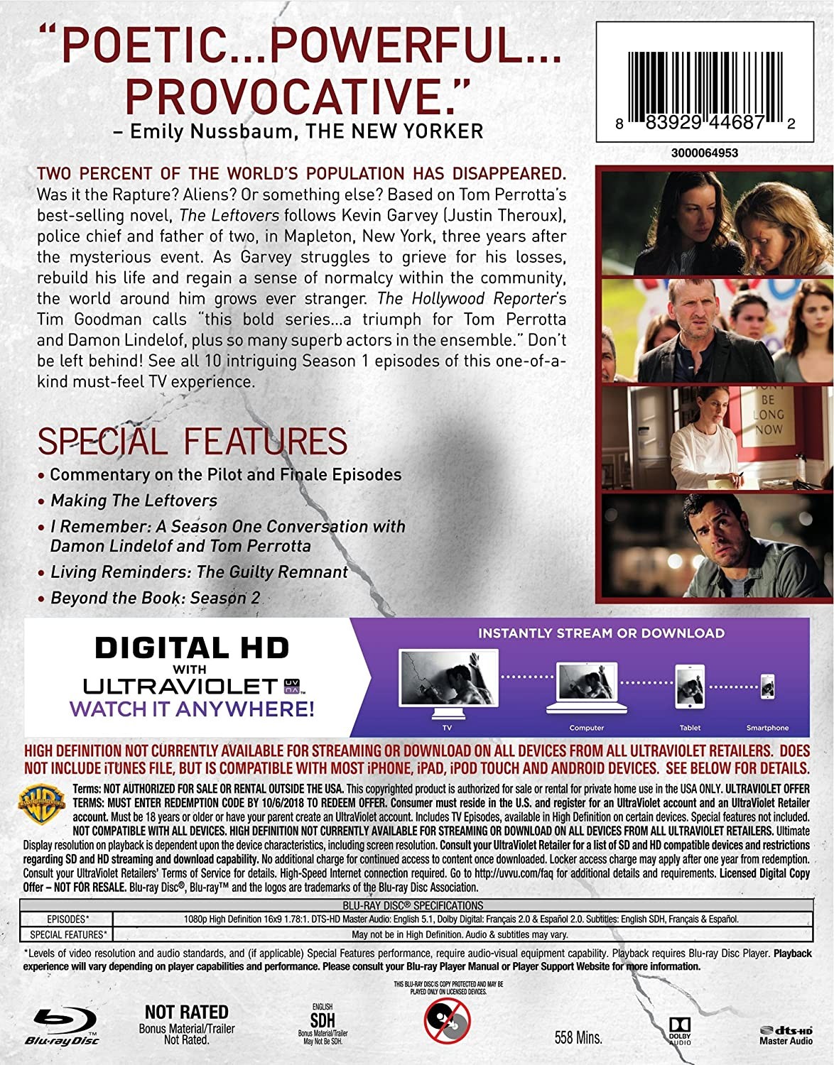 Cantidad de Discos: 2 | Lanzamiento: 2014 | Género(s): Serie de TV, Intriga | Audio: Inglés, Francés, Español | SubtÃtulos: Español, Inglés, Francés | TÃtulo: The Leftovers | Director(es): Damon Lindelof (Creator), Tom Perrotta (Creator), Peter Berg, Mimi Leder | Reparto: Justin Theroux, Amy Brenneman, Christopher Eccleston, Carrie Coon, Ann Dowd, Amanda Warren, Liv Tyler, Michael Gaston, Margaret Qualley, Emily Meade, Max Carver, Regina King, Kevin Carroll, Jovan Adepo, Charlie Carver, Annie Q., Natalie Gold, Frank Harts, Danny Flaherty, Tiffani Barbour, Inna Muratova, Janel Moloney, Bill Camp | Norma / Región: NTSC (Región A) | Cantidad de Discos: 2 | Lanzamiento: 2014 | Género(s): Serie de TV, Intriga | Audio: Inglés, Francés, Español | SubtÃtulos: Español, Inglés, Francés | TÃtulo: The Leftovers | Director(es): Damon Lindelof (Creator), Tom Perrotta (Creator), Peter Berg, Mimi Leder | Reparto: Justin Theroux, Amy Brenneman, Christopher Eccleston, Carrie Coon, Ann Dowd, Amanda Warren,