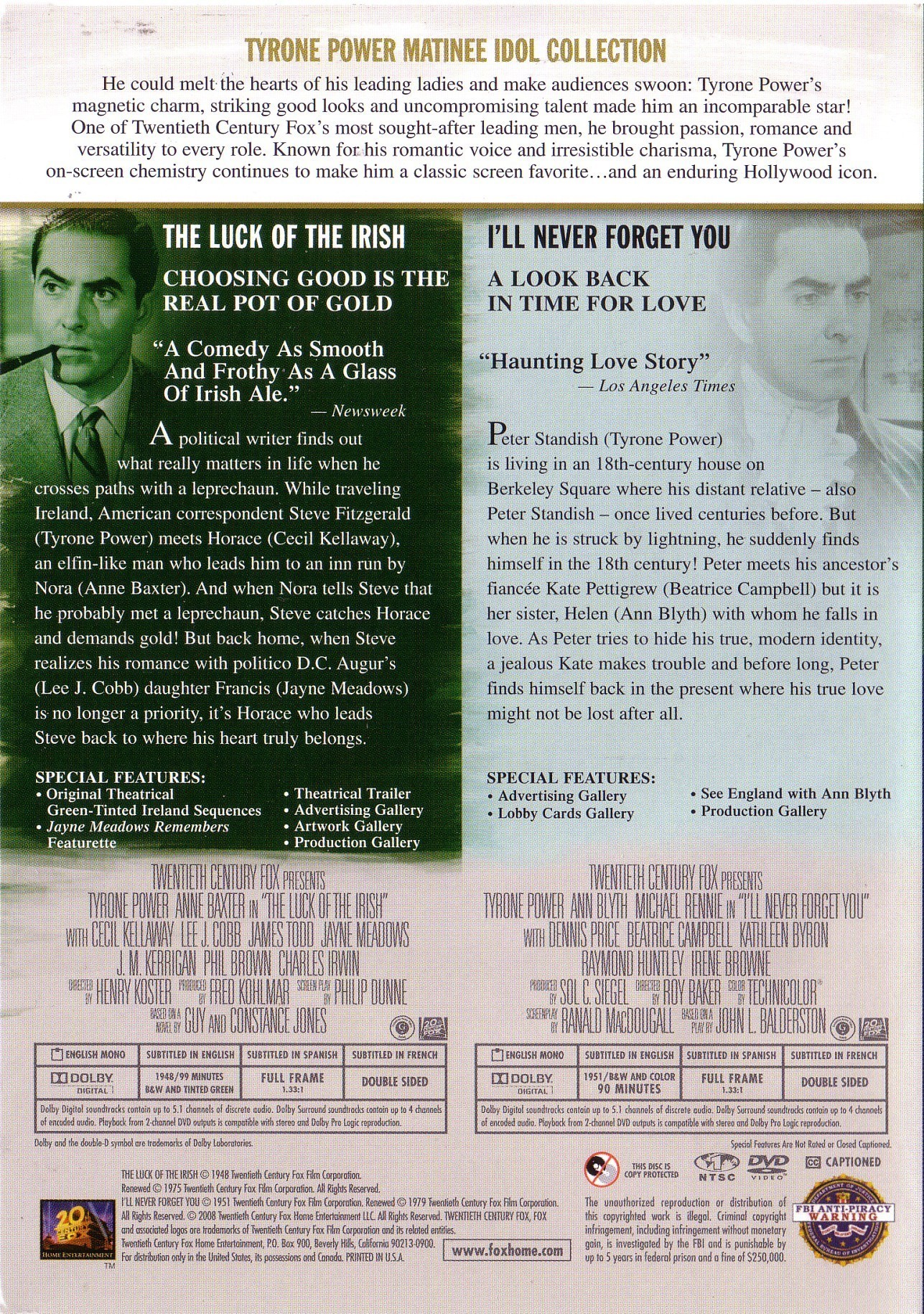 Tyrone Power, Ann Blyth, Michael Rennie, Dennis Price, Beatrice Campbell, Kathleen Byron, Raymond Huntley, Irene Browne | Norma / Región: NTSC 1 | Cantidad de Discos: 1 | Lanzamiento: 2010 | Género(s): Romance. Comedia. Fantástico. Drama. | Audio: Inglés (Dolby Digital Mono) | SubtÃtulos: Español, Inglés, Francés | TÃtulo: El amor que tú me diste (1948) / Hombre de dos mundos o Nunca te olvidaré o The House in the Square (1951) | Director(es): Henry Koster / Roy Ward Baker | Reparto: Tyrone Power, Anne Baxter, Cecil Kellaway, Lee J. Cobb, James Todd, Jayne