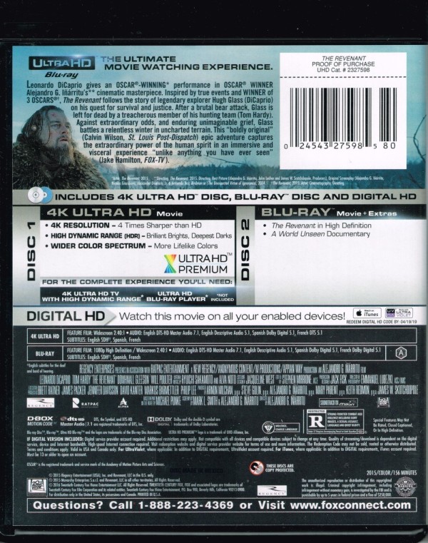 Cantidad de Discos: 1 4K + 1 BluRay | Lanzamiento: 2015 | Género(s): Western | Audio: Inglés (7.1 DTS-HD Master Audio), Inglés (Audio Description Dolby Digital 5.1) | SubtÃtulos: Español, Inglés, Francés | TÃtulo: El renacido | Director(es): Alejandro González Iñárritu | Reparto: Leonardo DiCaprio, Tom Hardy, Domhnall Gleeson, Will Poulter, Forrest Goodluck, Paul Anderson, Kristoffer Joner, Joshua Burge, Duane Howard, Melaw Nakehk’o, Fabrice Adde, Arthur RedCloud, Christopher Rosamond, Robert Moloney, Lukas Haas, Brendan Fletcher, Tyson Wood, McCaleb Burnett | Norma / Región: NTSC (Región A) | Cantidad de Discos: 1 4K + 1 BluRay | Lanzamiento: 2015 | Género(s): Western | Audio: Inglés (7.1 DTS-HD Master Audio), Inglés (Audio Description Dolby Digital 5.1) | SubtÃtulos: Español, Inglés, Francés | TÃtulo: El renacido | Director(es): Alejandro González Iñárritu | Reparto: Leonardo DiCaprio, Tom Hardy, Domhnall Gleeson, Will Poulter, Forrest Goodluck, Paul Anderson, Kristoffer Joner, Joshu