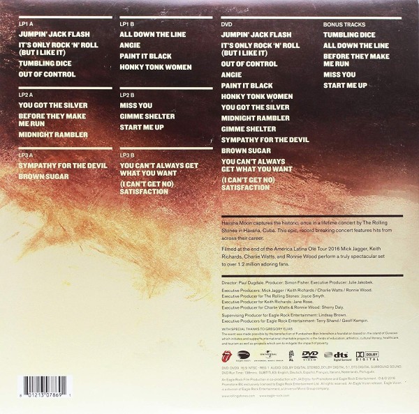 Artista(s) / Grupo: The Rolling Stones | Cantidad de Discos: 3 LP + 1 DVD | Lanzamiento: 2016 | Género(s): Rock | Estilo(s): Blues Rock, Rock & Roll, Pop Rock | Audio: Inglés (Dobly Digital 5,1) | SubtÃtulos: Inglés, Español, Francés, Danés, Alemán | TÃtulo: Havana Moon | Norma / Región: NTSC 1 | Artista(s) / Grupo: The Rolling Stones | Cantidad de Discos: 3 LP + 1 DVD | Lanzamiento: 2016 | Género(s): Rock | Estilo(s): Blues Rock, Rock & Roll, Pop Rock | Audio: Inglés (Dobly Digital 5,1) | SubtÃtulos: Inglés, Español, Francés, Danés, Alemán | TÃtulo: Havana Moon | Norma / Región: NTSC 1