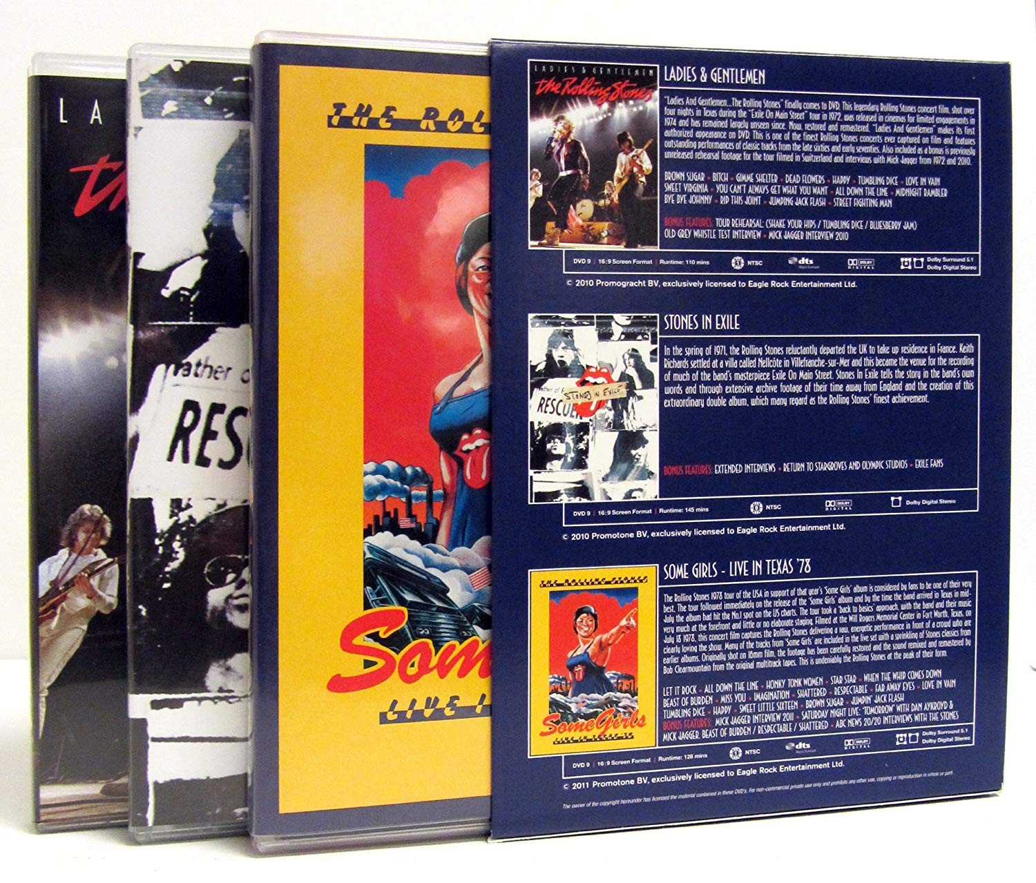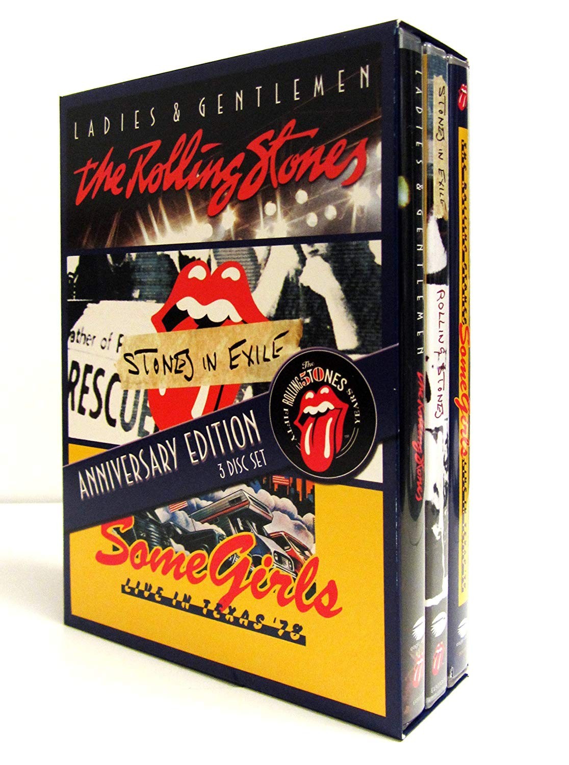 Esta edición limitada, edición de aniversario, lanzada para celebrar el 50 aniversario de los Rolling Stones, reúne tres DVD clásicos de Rolling Stones en un solo set por primera vez. Ladies & Gentlemen fue filmada en la gira por la banda en Estados Unidos en 1972 para apoyar el clásico álbum Exile On Main Street. Stones In Exile cuenta la historia de la creación del álbum Exile On Main Street. Some Girls: Live In Texas ’78 captura a la banda en plena forma durante su gira por 1978 en Estados Unidos