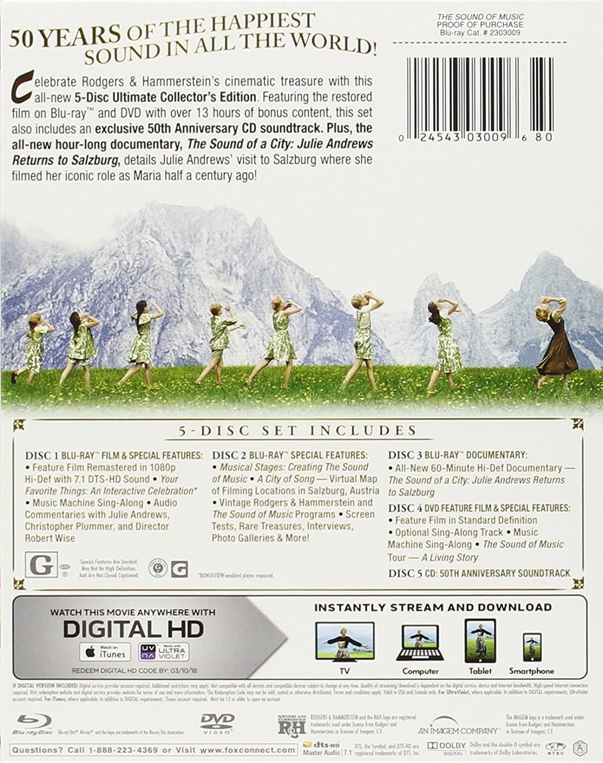 Cantidad de Discos: 3 Blu ray + 1 DVD + 1 CD | Lanzamiento: 2015 | Género(s): Musical | Audio: Inglés, Español, Francés | SubtÃtulos: Español, Inglés, Francés | TÃtulo: The Sound of Music (50th Anniversary) | Director(es): Robert Wise | Reparto: Julie Andrews, Christopher Plummer, Richard Haydn, Eleanor Parker, Peggy Wood, Heather Menzies, Charmian Carr, Anna Lee, Marni Nixon | Norma / Región: NTSC (Región A) | Cantidad de Discos: 3 Blu ray + 1 DVD + 1 CD | Lanzamiento: 2015 | Género(s): Musical | Audio: Inglés, Español, Francés | SubtÃtulos: Español, Inglés, Francés | TÃtulo: The Sound of Music (50th Anniversary) | Director(es): Robert Wise | Reparto: Julie Andrews, Christopher Plummer, Richard Haydn, Eleanor Parker, Peggy Wood, Heather Menzies, Charmian Carr, Anna Lee, Marni Nixon | Norma / Región: NTSC (Región A)