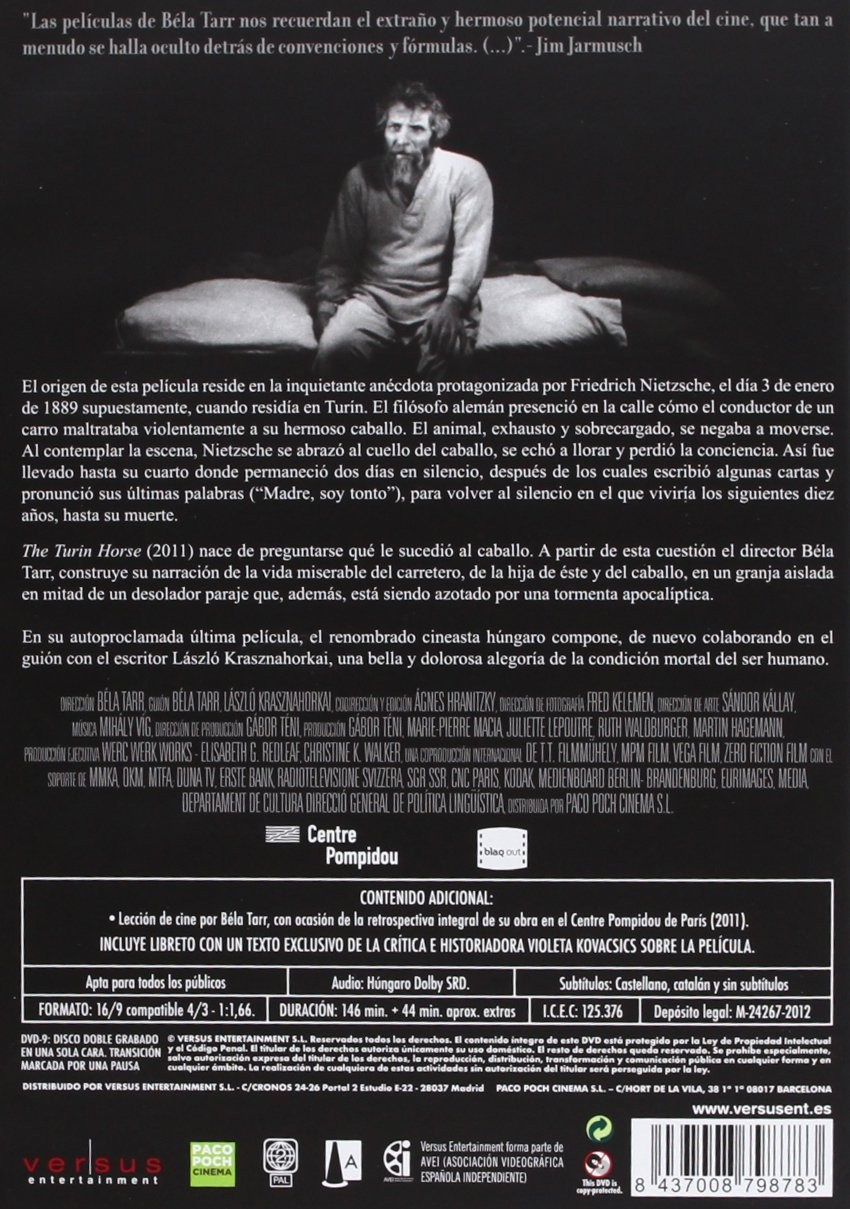 Cantidad de Discos: 1 | Lanzamiento: 2012 | Género(s): Drama | Audio: Húngaro | SubtÃtulos: Castellano, Catalán | TÃtulo: The Turin Horse | Director(es): Béla Tarr | Reparto: János Derzsi, Erika Bók, Mihály Kormo, Ricsi | Norma / Región: PAL (Región 2) | Cantidad de Discos: 1 | Lanzamiento: 2012 | Género(s): Drama | Audio: Húngaro | SubtÃtulos: Castellano, Catalán | TÃtulo: The Turin Horse | Director(es): Béla Tarr | Reparto: János Derzsi, Erika Bók, Mihály Kormo, Ricsi | Norma / Región: PAL (Región 2)