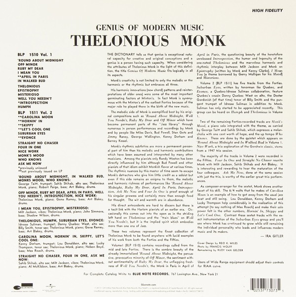 Artista(s) / Grupo: Thelonious Monk | Cantidad de Discos: 1 LP | Lanzamiento: 2014 | Género(s): Jazz | Estilo(s): Bop | Título: Genius Of Modern Music Volume One | Artista(s) / Grupo: Thelonious Monk | Cantidad de Discos: 1 LP | Lanzamiento: 2014 | Género(s): Jazz | Estilo(s): Bop | Título: Genius Of Modern Music Volume One