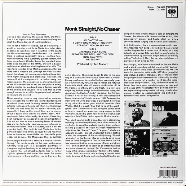 Artista(s) / Grupo: Thelonious Monk | Cantidad de Discos: 1 LP | Lanzamiento: 2013 | Género(s): Jazz | Estilo(s): Bop, Cool Jazz | Título: Straight, No Chaser | Artista(s) / Grupo: Thelonious Monk | Cantidad de Discos: 1 LP | Lanzamiento: 2013 | Género(s): Jazz | Estilo(s): Bop, Cool Jazz | Título: Straight, No Chaser