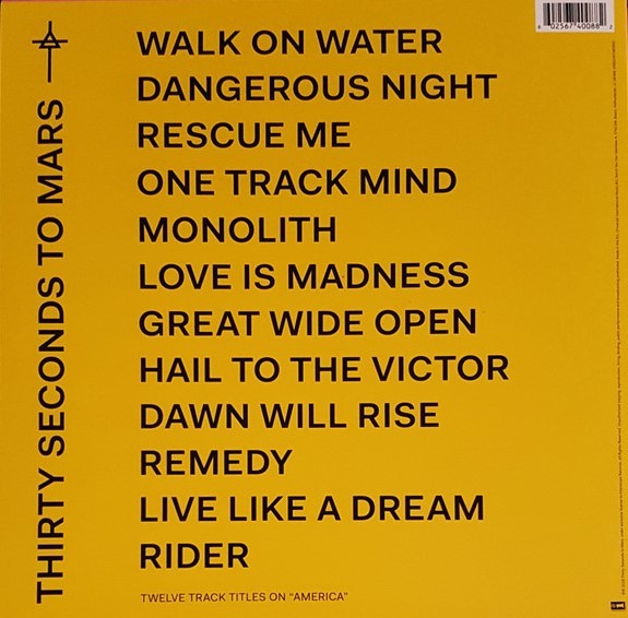 Artista(s) / Grupo: Thirty Seconds To Mars | Cantidad de Discos: 1 LP Color Disc | Lanzamiento: 20148 | Género(s): Rock | Estilo(s): Electro, Art Rock | Título: America | Artista(s) / Grupo: Thirty Seconds To Mars | Cantidad de Discos: 1 LP Color Disc | Lanzamiento: 20148 | Género(s): Rock | Estilo(s): Electro, Art Rock | Título: America | Artista(s) / Grupo: Thirty Seconds To Mars | Cantidad de Discos: 1 LP Color Disc | Lanzamiento: 20148 | Género(s): Rock | Estilo(s): Electro, Art Rock | Título: America