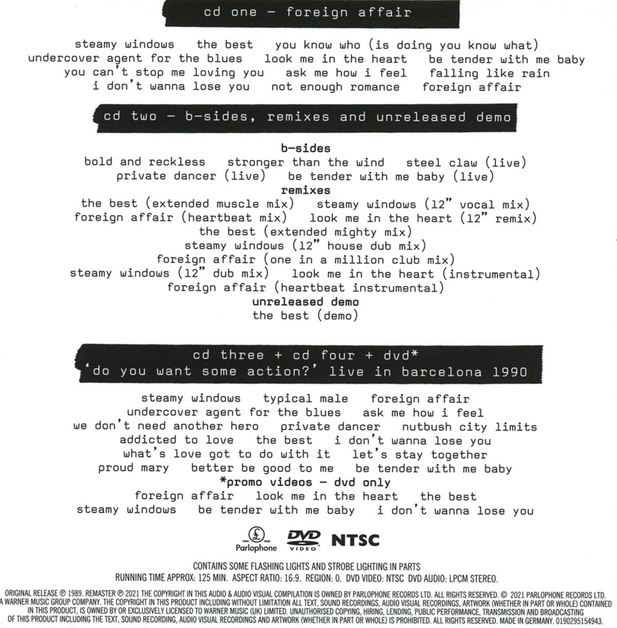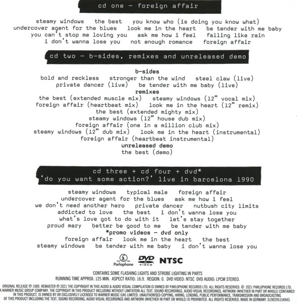 Artista(s) / Grupo: Tina Turner | Cantidad de Discos: 1 DVD + 4 CD + Libro + Fotos | Lanzamiento: 2021 | Género(s): Electronic, Rock, Pop | Estilo(s): Pop Rock, Soft Rock, Synth-pop | TÃtulo: Foreign Affair – Deluxe edition | Artista(s) / Grupo: Tina Turner | Cantidad de Discos: 1 DVD + 4 CD + Libro + Fotos | Lanzamiento: 2021 | Género(s): Electronic, Rock, Pop | Estilo(s): Pop Rock, Soft Rock, Synth-pop | TÃtulo: Foreign Affair – Deluxe edition