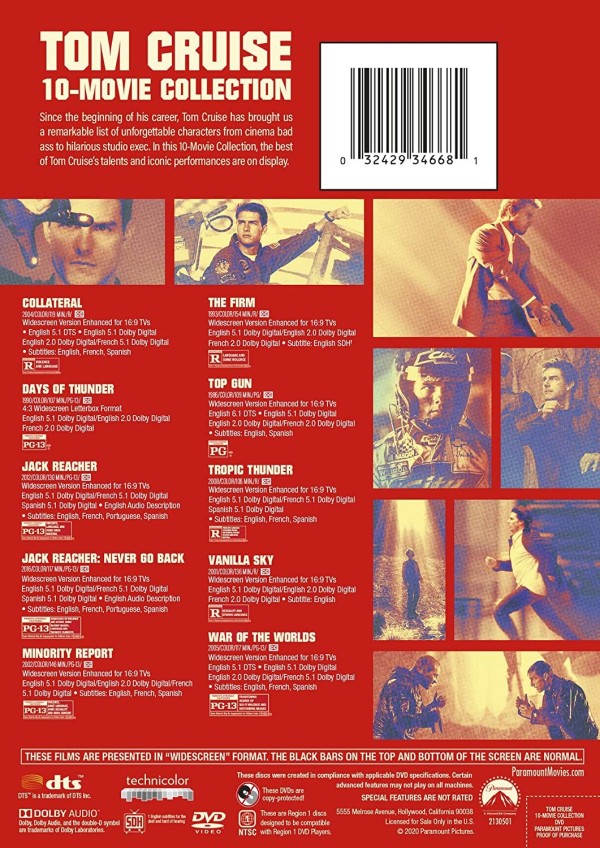 Título: Tom Cruise – 10-Movie Collection: Colateral (2004) / Días de trueno (1990) / Jack Reacher: Bajo la mira (2012) / Jack Reacher: Sin regreso (2016) / Minority report: Sentencia previa (2002) / Fachada (1993) / Top Gun: Pasión y gloria (1986) / Una guerra de película (2008) / Vanilla Sky (2001) / La guerra de los mundos (2005)