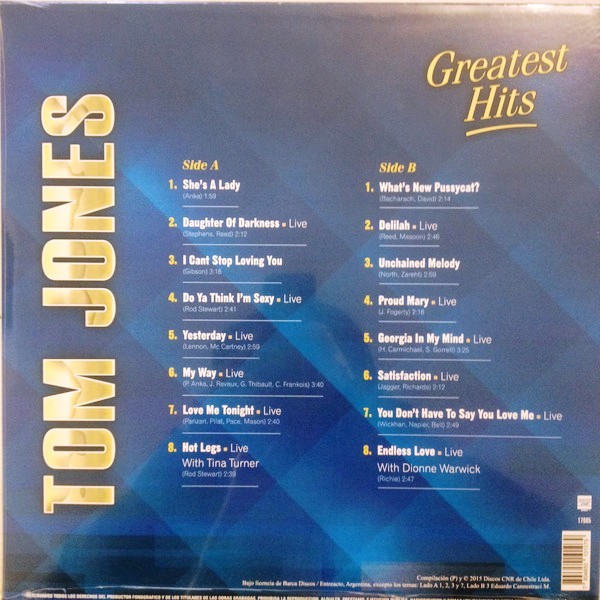 Artista(s) / Grupo: Tom Jones | Cantidad de Discos: 1 LP | Estilo(s): pop | TÃtulo: Greatest Hits | Artista(s) / Grupo: Tom Jones | Cantidad de Discos: 1 LP | Estilo(s): pop | TÃtulo: Greatest Hits