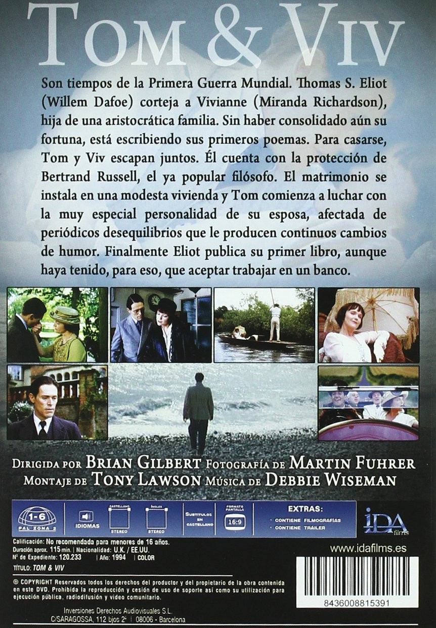 Cantidad de Discos: 1 | Lanzamiento: 1994 | Género(s): Drama. | Audio: Castellano, Inglés | SubtÃtulos: Castellano, Inglés | TÃtulo: Tom & Viv | Director(es): Brian Gilbert. | Reparto: Willem Dafoe, Miranda Richardson, Rosemary Harris, Tim Dutton, Nickolas Grace, Geoffrey Bayldon, Clare Holman, Philip Locke, Joanna McCallum, Joseph O’Conor. | Norma / Región: PAL (Región 2) | Cantidad de Discos: 1 | Lanzamiento: 1994 | Género(s): Drama. | Audio: Castellano, Inglés | SubtÃtulos: Castellano, Inglés | TÃtulo: Tom & Viv | Director(es): Brian Gilbert. | Reparto: Willem Dafoe, Miranda Richardson, Rosemary Harris, Tim Dutton, Nickolas Grace, Geoffrey Bayldon, Clare Holman, Philip Locke, Joanna McCallum, Joseph O’Conor. | Norma / Región: PAL (Región 2)