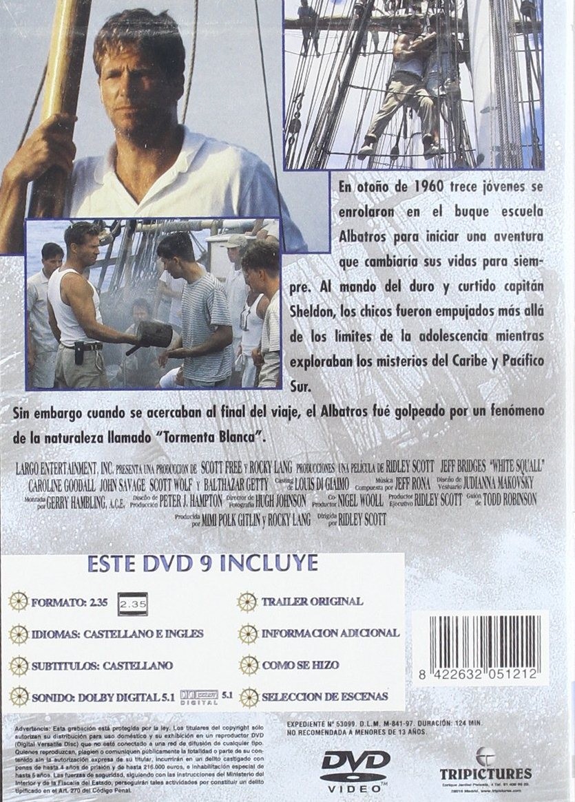 Cantidad de Discos: 1 | Lanzamiento: 1996 | Género(s): Aventuras, Drama | Audio: Español, Inglés | SubtÃtulos: Español | TÃtulo: White Squall | Director(es): Ridley Scott | Reparto: Jeff Bridges, David Lascher, Ryan Phillippe, Ethan Embry, Scott Wolf, Eric Michael Cole, Jeremy Sisto, Jason Marsden, Balthazar Getty, John Savage, Caroline Goodall, Peyton Thomas, Julio Mechoso, David Selby | Norma / Región: Multizona | Cantidad de Discos: 1 | Lanzamiento: 1996 | Género(s): Aventuras, Drama | Audio: Español, Inglés | SubtÃtulos: Español | TÃtulo: White Squall | Director(es): Ridley Scott | Reparto: Jeff Bridges, David Lascher, Ryan Phillippe, Ethan Embry, Scott Wolf, Eric Michael Cole, Jeremy Sisto, Jason Marsden, Balthazar Getty, John Savage, Caroline Goodall, Peyton Thomas, Julio Mechoso, David Selby | Norma / Región: Multizona