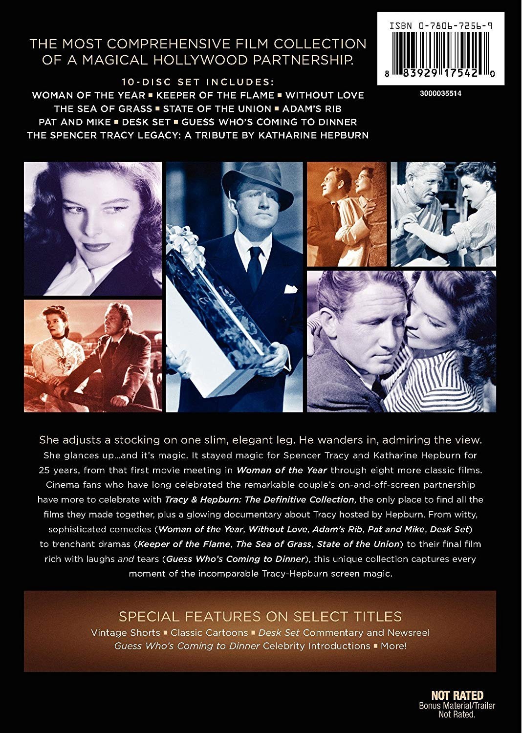 Cantidad de Discos: 10 | Lanzamiento: 2011 | Género(s): Drama, Comedia. Romance | Audio: Inglés (Dolby Digital 5,1), Español (Dolby Digital Stereo, Dolby Digital 5,1), Francés (Dolby Digital Stereo, Dolby Digital 5,1) | Subtítulos: Español, Inglés, Francés | Título: Tracy & Hepburn – La colección definitiva – La mujer del año (1942) / Sin amor (1945) / El estado de la Unión (1948) / Mar de hierba (1947) / La Costilla de Adán (1949) / Pat y Mike (1952) / Juego de mesa (1957) / Adivina quién viene a cenar (1967) / Ídolos de barro (1942) / El legado de Spencer Tracy: un homenaje de Katherine Hepburn (1986) | Director(es): George Stevens / Harold S. Bucquet / Frank Capra / Elia Kazan / George Cukor / George Cukor / Walter Lang / Stanley Kramer / George Cukor / David Heeley | Reparto: Spencer Tracy, Katharine Hepburn, Fay Bainter, Reginald Owen, William Bendix, Dan Tobin, Roscoe Karns /