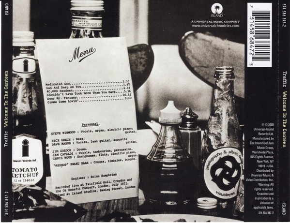 Artista(s) / Grupo: Traffic | Cantidad de Discos: 1 CD | Lanzamiento: 2002 | Género(s): Rock, Blues, Folk, World, & Country | Estilo(s): Blues Rock, Electric Blues, Modern Electric Blues | TÃtulo: Welcome To The Canteen | Artista(s) / Grupo: Traffic | Cantidad de Discos: 1 CD | Lanzamiento: 2002 | Género(s): Rock, Blues, Folk, World, & Country | Estilo(s): Blues Rock, Electric Blues, Modern Electric Blues | TÃtulo: Welcome To The Canteen