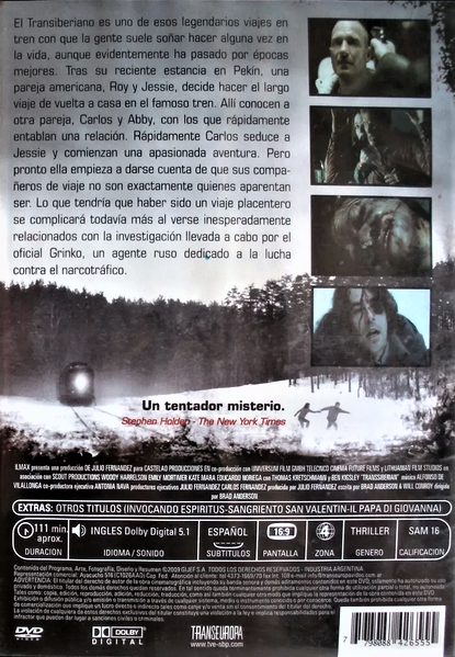 | Norma / Región: NTSC (Región 4) | Cantidad de Discos: 1 | Lanzamiento: 2008 | Género(s): Thriller, Drama | Audio: Inglés (Dolby Digital 5,1) | SubtÃtulos: Español | TÃtulo: Transsiberian | Director(es): Brad Anderson | Reparto: Woody Harrelson, Emily Mortimer, Kate Mara, Eduardo Noriega, Thomas Kretschmann, Ben Kingsley, Colin Stinton, Etienne Chicot, Mac McDonald