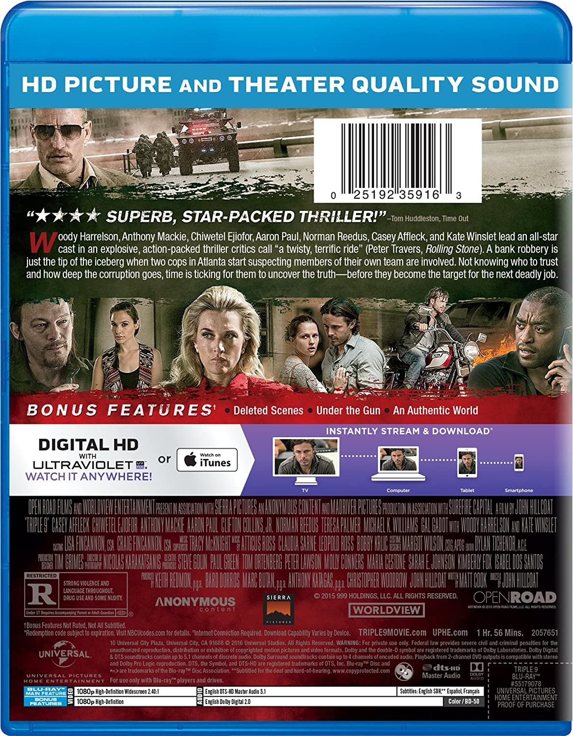 Cantidad de Discos: 1 | Lanzamiento: 2016 | Género(s): Thriller | Audio: Inglés, Francés, Español | SubtÃtulos: Español, Inglés, Francés | TÃtulo: Triple 9 | Director(es): John Hillcoat | Reparto: Casey Affleck, Chiwetel Ejiofor, Kate Winslet, Aaron Paul, Woody Harrelson, Anthony Mackie, Clifton Collins Jr., Norman Reedus, Luis Da Silva Jr., Gal Gadot, Teresa Palmer, Michael Kenneth Williams, Michelle Ang, Natalie Pero, Terri Abney, Dale Liner | Norma / Región: NTSC (Región A) | Cantidad de Discos: 1 | Lanzamiento: 2016 | Género(s): Thriller | Audio: Inglés, Francés, Español | SubtÃtulos: Español, Inglés, Francés | TÃtulo: Triple 9 | Director(es): John Hillcoat | Reparto: Casey Affleck, Chiwetel Ejiofor, Kate Winslet, Aaron Paul, Woody Harrelson, Anthony Mackie, Clifton Collins Jr., Norman Reedus, Luis Da Silva Jr., Gal Gadot, Teresa Palmer, Michael Kenneth Williams, Michelle Ang, Natalie Pero, Terri Abney, Dale Liner | Norma / Región: NTSC (Región A)