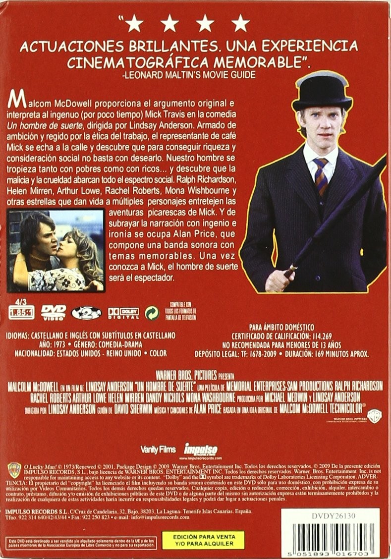 Cantidad de Discos: 1 | Lanzamiento: 2007 | Género(s): Comedia, Drama | Audio: Español (Dolby Digital 2.0), Inglés (Dolby Digital 2.0) | SubtÃtulos: Español | TÃtulo: O Lucky Man! (1973) | Director(es): Lindsay Anderson | Reparto: Malcolm McDowell, Ralph Richardson, Rachel Roberts, Arthur Lowe, Helen Mirren, Graham Crowden, Peter Jeffrey, Dandy Nichols, Mona Washbourne | Norma / Región: PAL (Región 2) | Cantidad de Discos: 1 | Lanzamiento: 2007 | Género(s): Comedia, Drama | Audio: Español (Dolby Digital 2.0), Inglés (Dolby Digital 2.0) | SubtÃtulos: Español | TÃtulo: O Lucky Man! (1973) | Director(es): Lindsay Anderson | Reparto: Malcolm McDowell, Ralph Richardson, Rachel Roberts, Arthur Lowe, Helen Mirren, Graham Crowden, Peter Jeffrey, Dandy Nichols, Mona Washbourne | Norma / Región: PAL (Región 2)