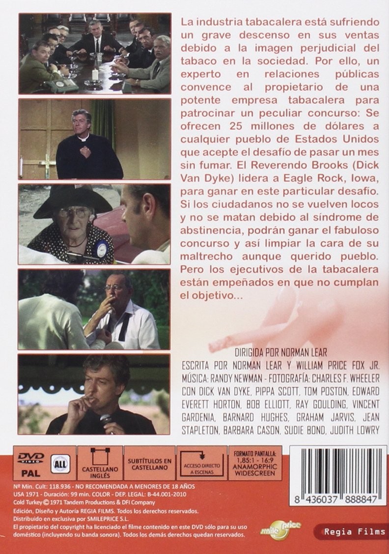 Cantidad de Discos: 1 | Lanzamiento: 1971 | Género(s): Comedia. | Audio: Castellano, Inglés | SubtÃtulos: Castellano | TÃtulo: Cold Turkey | Director(es): Norman Lear. | Reparto: Dick Van Dyke, Pippa Scott, Tom Poston, Edward Everett Horton, Bob Elliott, Ray Goulding, Vincent Gardenia, Barnard Hughes, Graham Jarvis, Jean Stapleton, Barbara Cason, Sudie Blond, Judith Lowry, Helen Page Camp, Paul Benedict. | Norma / Región: PAL (Región 2) | Cantidad de Discos: 1 | Lanzamiento: 1971 | Género(s): Comedia. | Audio: Castellano, Inglés | SubtÃtulos: Castellano | TÃtulo: Cold Turkey | Director(es): Norman Lear. | Reparto: Dick Van Dyke, Pippa Scott, Tom Poston, Edward Everett Horton, Bob Elliott, Ray Goulding, Vincent Gardenia, Barnard Hughes, Graham Jarvis, Jean Stapleton, Barbara Cason, Sudie Blond, Judith Lowry, Helen Page Camp, Paul Benedict. | Norma / Región: PAL (Región 2)