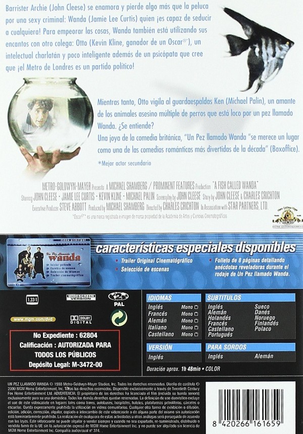 Cantidad de Discos: 1 | Lanzamiento: 2006 | Audio: Inglés, Francés, Español, Portugués, Alemán, Italiano | SubtÃtulos: Español, Inglés, Italiano, Sueco, Noruego, Danés, Finlandés, Francés, Islandés, Holandés, Alemán | TÃtulo: Un Pez Llamado Wanda | Director(es): Charles Crichton | Reparto: John Cleese, Kevin Kline, Jamie Lee Curtis, Michael Palin, Maria Aitken | Norma / Región: PAL (Región 2) | Cantidad de Discos: 1 | Lanzamiento: 2006 | Audio: Inglés, Francés, Español, Portugués, Alemán, Italiano | SubtÃtulos: Español, Inglés, Italiano, Sueco, Noruego, Danés, Finlandés, Francés, Islandés, Holandés, Alemán | TÃtulo: Un Pez Llamado Wanda | Director(es): Charles Crichton | Reparto: John Cleese, Kevin Kline, Jamie Lee Curtis, Michael Palin, Maria Aitken | Norma / Región: PAL (Región 2)