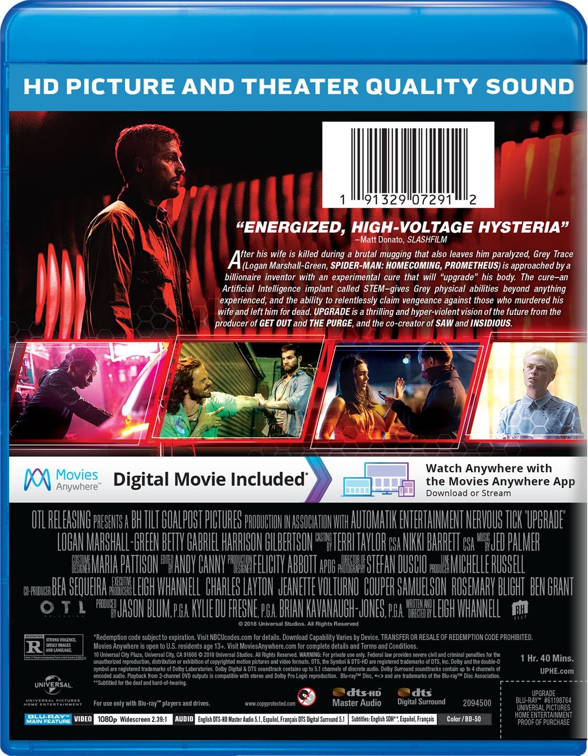 Cantidad de Discos: 1 | Lanzamiento: 2018 | Género(s): Ciencia ficción, Thriller, Fantástico | Audio: Inglés (Dolby Digital 5,1), Español (Dolby Digital Stereo, Dolby Digital 5,1), Francés (Dolby Digital Stereo, Dolby Digital 5,1) | Subtítulos: Español, Inglés, Francés | Título: Upgrade | Director(es): Leigh Whannell | Reparto: Logan Marshall-Green, Betty Gabriel, Harrison Gilbertson, Simon Maiden, Benedict Hardie, Melanie Vallejo, Richard Cawthorne, Christopher Kirby, Linda Cropper, Steve Danielsen, Richard Anastasios, Kenny Low, Emily Havea, Ming-Zhu Hii, Stephanie Demkiw, Manjot Jassal, Esther Joseph, Sachin Joab, Clayton Jacobson, Arthur Angel, Puven Pather, Ri-Jie Kwok, Dave Mondon, Rosco Campbell, Kai Bradley, Michael M. Foster, Zia Kelly, Mark Doggett | Norma / Región: NTSC (Región A) | Cantidad de Discos: 1 | Lanzamiento: 2018 | Género(s): Ciencia ficción, Thriller, Fantástico | Audio: Inglés (Dolby Digital 5,1), Español (Dolby Digital Stereo, Dolby Digital 5,1), Francés (Dolby Digi