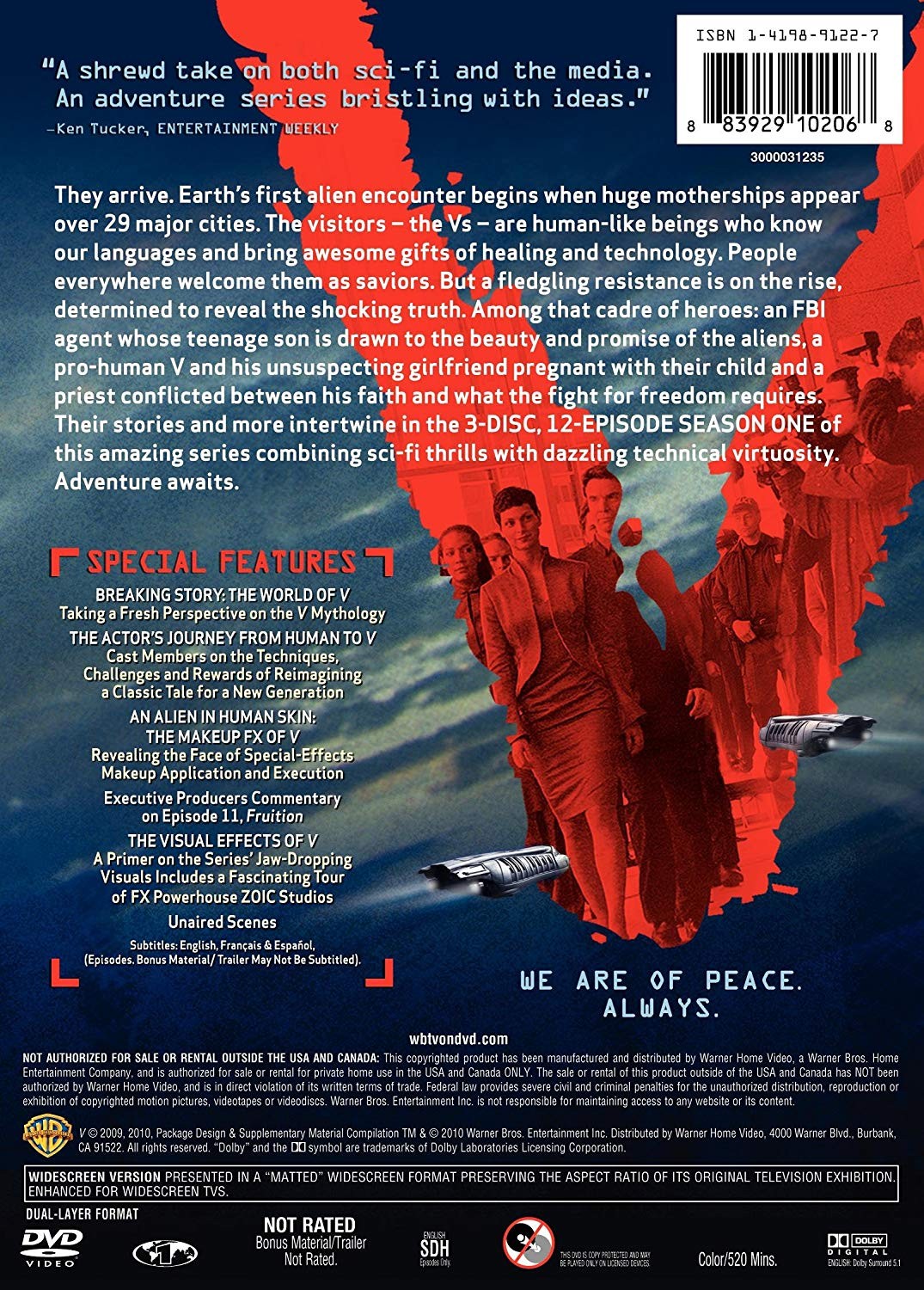 Los visitantes están entre nosotros. En un solo momento compartido, aparecen en todas las ciudades importantes del mundo, promoviendo un mensaje de paz. Quieren compartir su conocimiento de la tecnologÃa; Quieren que nos unamos. Y cuentan con un componente muy importante de la naturaleza humana: la devoción. Al principio considerado una amenaza, los Visitantes, o V, se convierten rápidamente en una fascinación. Pero cuando la agente antiterrorista del FBI Erica Evans descubre lo que se esconde debajo del exterior alarmantemente humano de los V, resistir a este nuevo mundo nunca ha sido más importante, y nunca ha habido más en juego. Realmente es el amanecer de un nuevo dÃa.