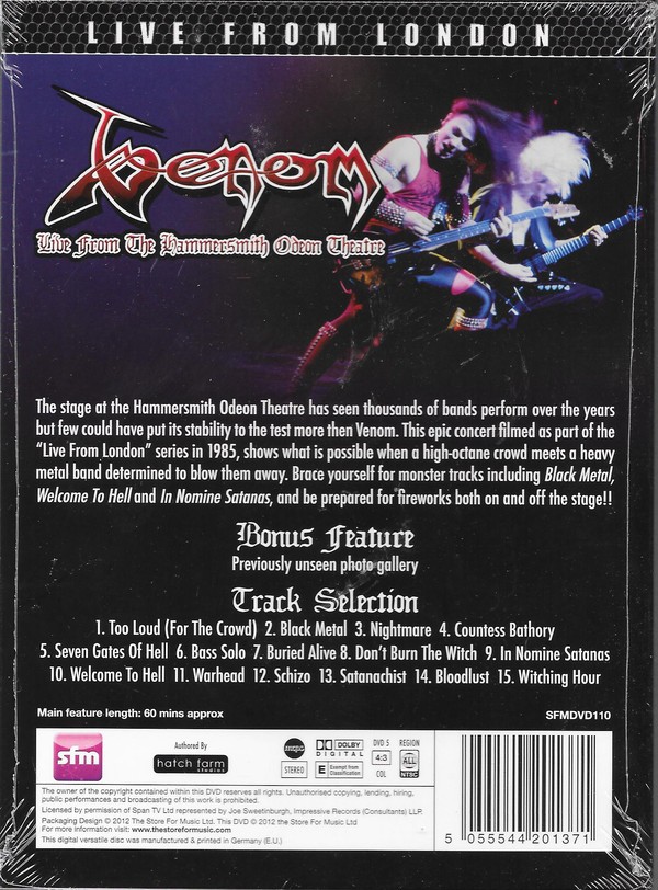 Artista(s) / Grupo: Venom | Cantidad de Discos: 1 | Lanzamiento: 2012 | Género(s): Rock | Estilo(s): Black Metal | Título: Live From The Hammersmith Odeon Theatre | Norma / Región: NTSC (Región 1, 4) | Artista(s) / Grupo: Venom | Cantidad de Discos: 1 | Lanzamiento: 2012 | Género(s): Rock | Estilo(s): Black Metal | Título: Live From The Hammersmith Odeon Theatre | Norma / Región: NTSC (Región 1, 4)