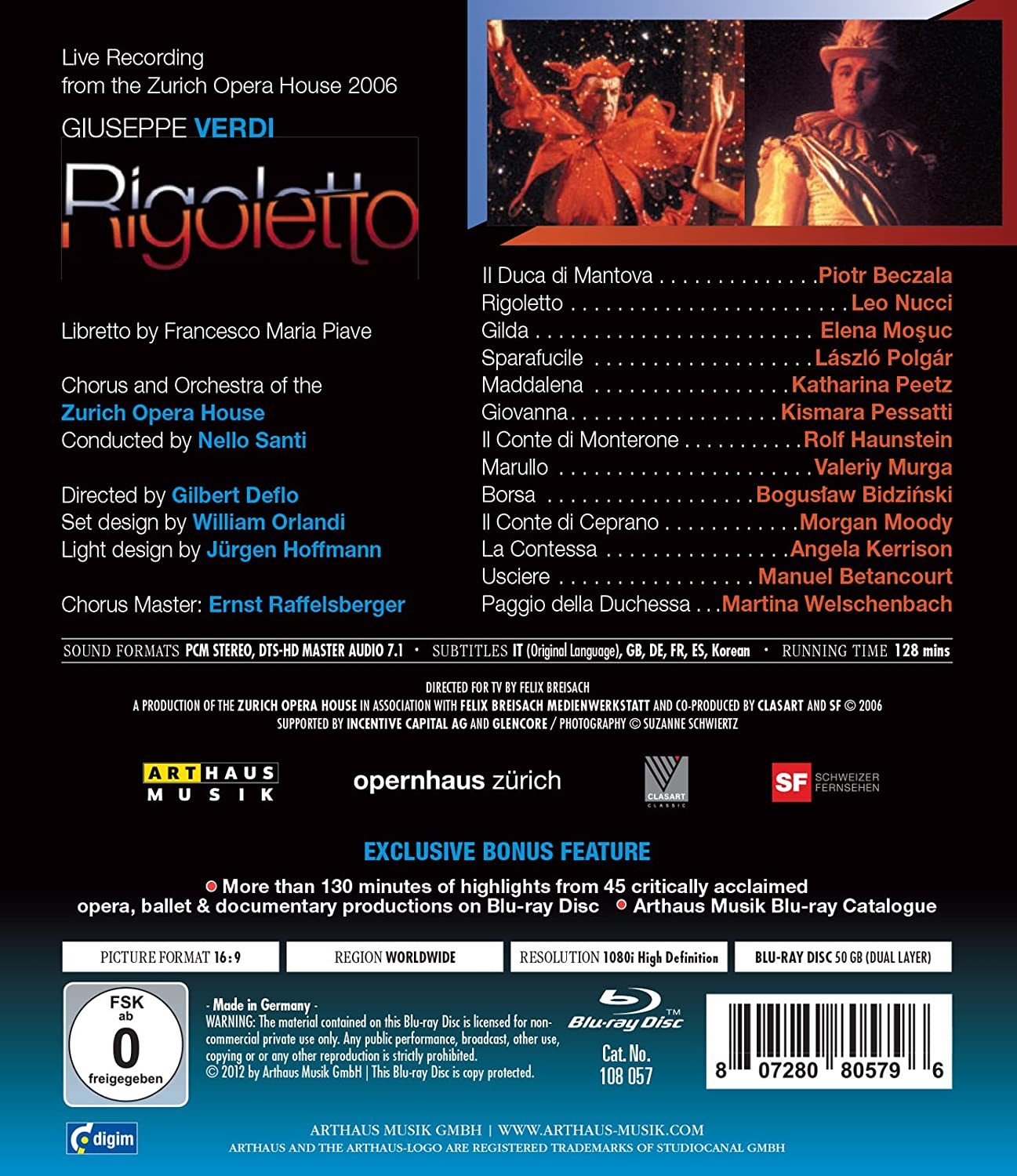 Una emocionante grabación en vivo de la Opernhaus Zurich está protagonizada por el aclamado barÃtono Leo Nucci como el homónimo de la ópera, junto a la inimitable Elena Mosuc como su hija Gilda, Piotr Beczala como el duque de Mantua y Lazslo Polgar como Sparafucile. ¡Otros 130 minutos de muestras de 45 producciones de ópera, ballet y documentales en Blu-ray lo hacen aún más atractivo!