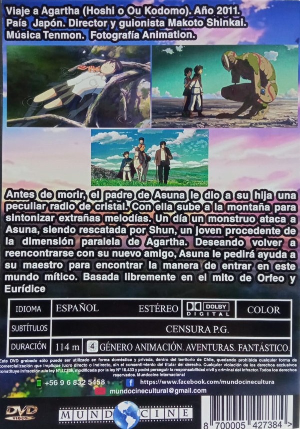 Antes de morir, el padre de Asuna le dio a su hija una peculiar radio de cristal. Con ella sube a la montaña para sintonizar extrañas melodÃas. Un dÃa un monstruo ataca a Asuna, siendo rescatada por Shun, un joven procedente de la dimensión paralela de Agartha. Deseando volver a reencontrarse con su nuevo amigo, Asuna le pedirá ayuda a su maestro para encontrar la manera de entrar en este mundo mÃtico. Basada libremente en el mito de Orfeo y EurÃdice, la tercera pelÃcula de Makoto Shinkai lo confirma como un creador de universos únicos, con un imaginario inagotable y un gusto estético exquisito.Â