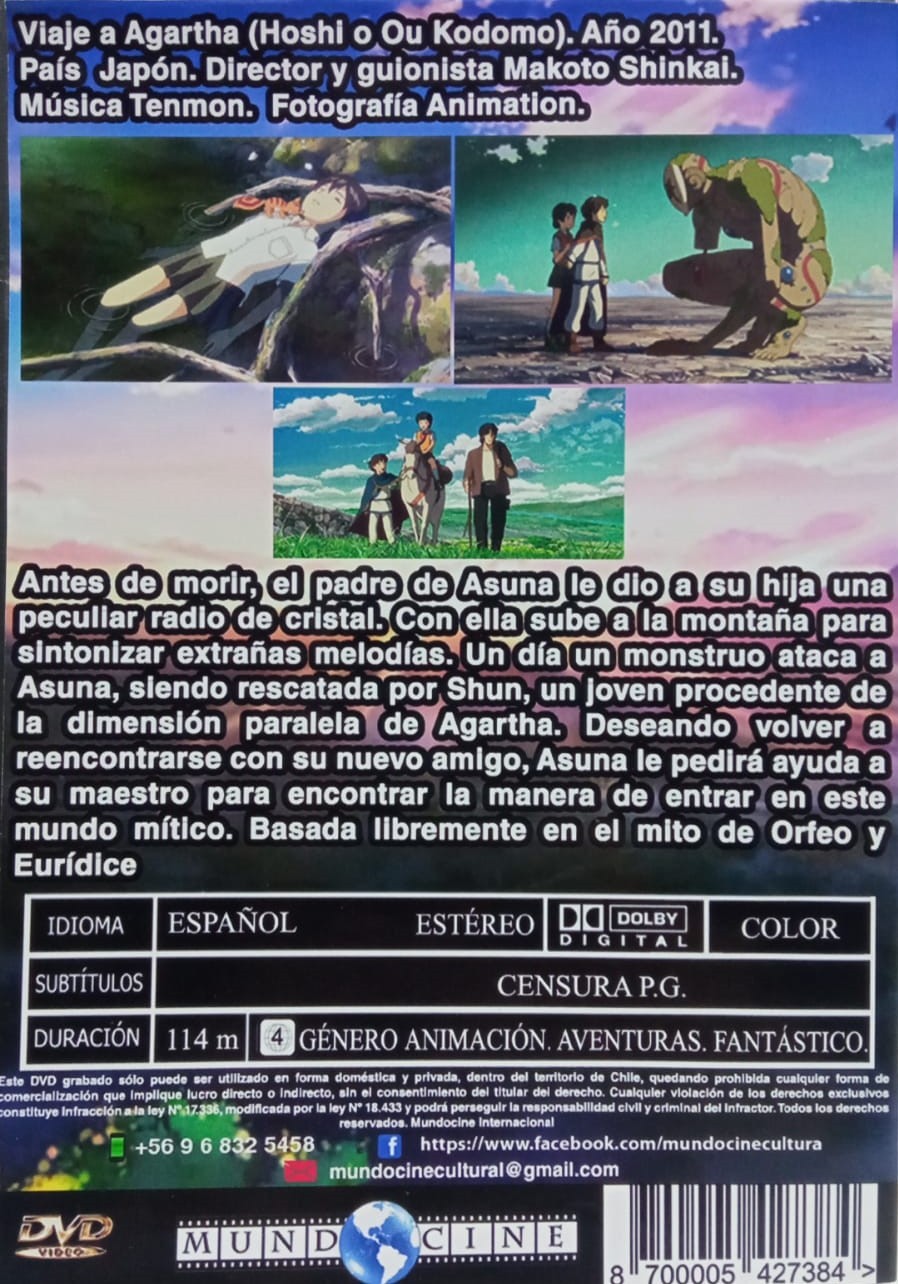 Cantidad de Discos: 1 DVD | Lanzamiento: 2011 | Género(s): ANIMACION | Audio: ESPAÑOL | TÃtulo: Hoshi o Ou Kodomo (Children Who Chase Lost Voices from Deep Below) | Director(es): Makoto Shinkai | Reparto: ANIMACION | Norma / Región: DISCO QUEMADO , ZONA 4 | Cantidad de Discos: 1 DVD | Lanzamiento: 2011 | Género(s): ANIMACION | Audio: ESPAÑOL | TÃtulo: Hoshi o Ou Kodomo (Children Who Chase Lost Voices from Deep Below) | Director(es): Makoto Shinkai | Reparto: ANIMACION | Norma / Región: DISCO QUEMADO , ZONA 4