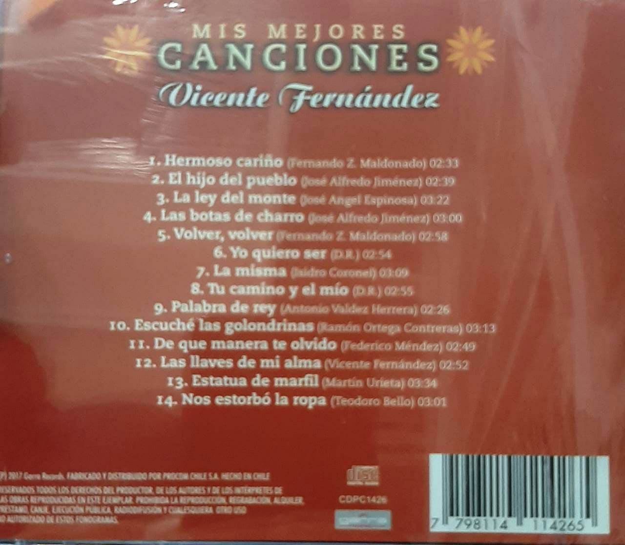 Artista(s) / Grupo: Vicente Fernandez | Cantidad de Discos: 1 | Lanzamiento: 2016 | Género(s): Rancheras | Estilo(s): Vocal, Ballad, Latin | TÃtulo: Mis mejores canciones | Artista(s) / Grupo: Vicente Fernandez | Cantidad de Discos: 1 | Lanzamiento: 2016 | Género(s): Rancheras | Estilo(s): Vocal, Ballad, Latin | TÃtulo: Mis mejores canciones