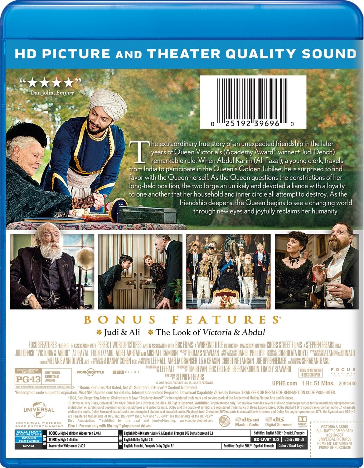 Cantidad de Discos: 1 BluRay + 1 DVD | Lanzamiento: 2017 | Género(s): Drama | Audio: Inglés (Dolby Digital 5,1), Español (Dolby Digital Stereo, Dolby Digital 5,1), Francés (Dolby Digital Stereo, Dolby Digital 5,1) | SubtÃtulos: Español, Inglés, Francés | TÃtulo: Victoria y Abdul | Director(es): Stephen Frears | Reparto: Judi Dench, Ali Fazal, Eddie Izzard, Adeel Akhtar, Paul Higgins, Michael Gambon, Tim Pigott-Smith, Olivia Williams, Robin Soans, Jonathan Harden, Sukh Ojla, Kemaal Deen-Ellis | Norma / Región: NTSC (Región A) | Cantidad de Discos: 1 BluRay + 1 DVD | Lanzamiento: 2017 | Género(s): Drama | Audio: Inglés (Dolby Digital 5,1), Español (Dolby Digital Stereo, Dolby Digital 5,1), Francés (Dolby Digital Stereo, Dolby Digital 5,1) | SubtÃtulos: Español, Inglés, Francés | TÃtulo: Victoria y Abdul | Director(es): Stephen Frears | Reparto: Judi Dench, Ali Fazal, Eddie Izzard, Adeel Akhtar, Paul Higgins, Michael Gambon, Tim Pigott-Smith, Olivia Williams, Robin Soans, Jonathan Harden, Suk