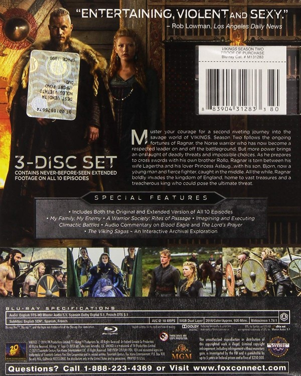 Cantidad de Discos: 3 | Lanzamiento: 2014 | Género(s): Serie de TV, Drama, Bélico | Audio: Inglés (Dolby Digital 5,1), Español (Dolby Digital 5,1) | SubtÃtulos: Español, Inglés, Francés | TÃtulo: Vikings – 2 Season | Director(es): Michael Hirst (Creator), Ken Girotti, Ciaran Donnelly, Jeff Woolnough, Stephen St. Leger, Helen Shaver, Daniel Grou, Johan Renck, Kari Skogland, Kelly Makin, Sarah Harding, Ben Bolt, David Wellington | Reparto: Travis Fimmel, Katheryn Winnick, Gustaf SkarsgÃ¥rd, Alexander Ludwig, Clive Standen, Maude Hirst, Alyssa Sutherland, Moe Dunford, Linus Roache, Gabriel Byrne, Jordan Patrick Smith, Alex Høgh Andersen, George Blagden, Jennie Jacques, John Kavanagh, Georgia Hirst, Jessalyn Gilsig, Peter Franzén, Jasper Pääkkönen, Edvin Endre, Jonathan Rhys Meyers, Jefferson Hall, Philip O’Sullivan, Marco Ilsø, Morgane Polanski, Josefin Asplund, Cormac Melia, Huw Parmenter, Ben Robson, Nathan O’Toole, Gaia Weiss, Lothaire Bluteau, Amy Bailey, Cathal O’Hallin, Donal Logue, Ivan Kay