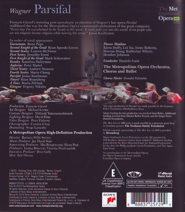 Artista(s) / Grupo: Wagner, Jonas Kaufmann, René Pape, Peter Mattei, Katarina Dalayman, Evgeny Nikitin, Metropolitan Opera Orchestra, Chorus* and Ballet, Daniele Gatti | Cantidad de Discos: 1 | Lanzamiento: 2014 | Género(s): Classical, Stage & Screen | Estilo(s): Opera | Título: Parsifal | Artista(s) / Grupo: Wagner, Jonas Kaufmann, René Pape, Peter Mattei, Katarina Dalayman, Evgeny Nikitin, Metropolitan Opera Orchestra, Chorus* and Ballet, Daniele Gatti | Cantidad de Discos: 1 | Lanzamiento: 2014 | Género(s): Classical, Stage & Screen | Estilo(s): Opera | Título: Parsifal