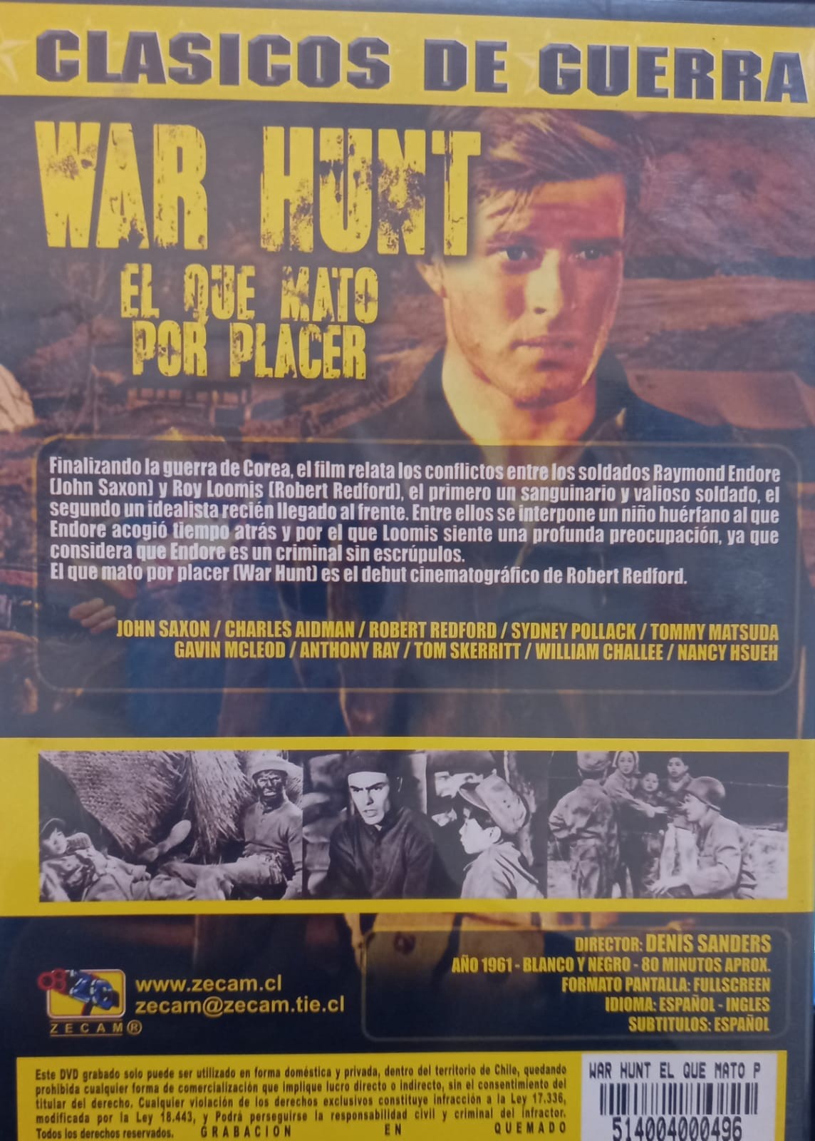 Cantidad de Discos: 1 | Lanzamiento: 2010 | Género(s): Bélico, Drama | Audio: Español, Inglés | SubtÃtulos: Español | TÃtulo: War Hunt (1962) | Director(es): Denis Sanders | Reparto: John Saxon, Charles Aidman, Sydney Pollack, Tommy Matsuda, Gavin MacLeod, Anthony Ray, Tom Skerritt, William Challee, Nancy Hsueh, Robert Redford, Francis Ford Coppola | Norma / Región: Multizona (Disco Quemado) | Cantidad de Discos: 1 | Lanzamiento: 2010 | Género(s): Bélico, Drama | Audio: Español, Inglés | SubtÃtulos: Español | TÃtulo: War Hunt (1962) | Director(es): Denis Sanders | Reparto: John Saxon, Charles Aidman, Sydney Pollack, Tommy Matsuda, Gavin MacLeod, Anthony Ray, Tom Skerritt, William Challee, Nancy Hsueh, Robert Redford, Francis Ford Coppola | Norma / Región: Multizona (Disco Quemado)